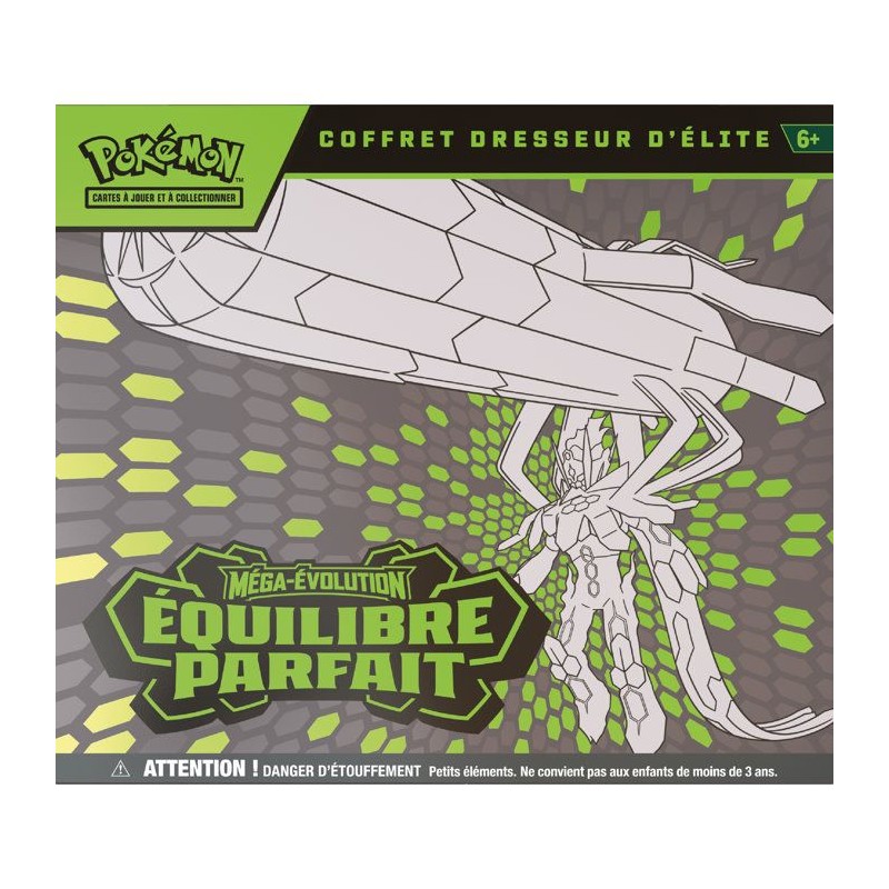 Le Coffret Dresseur d'Élite Méga-Évolution - Équilibre Parfait (ETB ME03) est le produit phare de la sortie du 27 mars 2026. Incontournable a chaque extension Pokémon, l'ETB est le choix de référence des Dresseurs qui veulent tout-en-un : boosters pour la collection, carte promo exclusive, accessoires de jeu compétitif et rangement — le tout aux couleurs de Méga-Zygarde-ex, gardien légendaire de l'équilibre d'Illumis.
