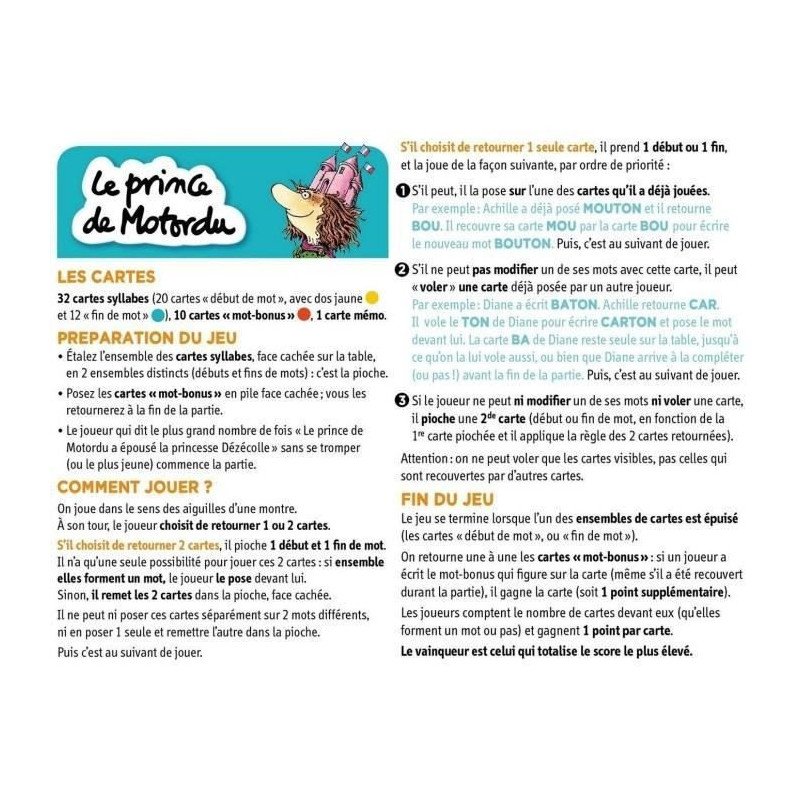 Avec le Prince de Motordu, fous rires garantis au Royaume des mots. Un jeu de cartes pour écrire, tordre et voler des mots. Les mots se composent avec les cartes début et fin.Celui qui crée le plus de mot, remporte la partie! Temps de jeu : 10 mn