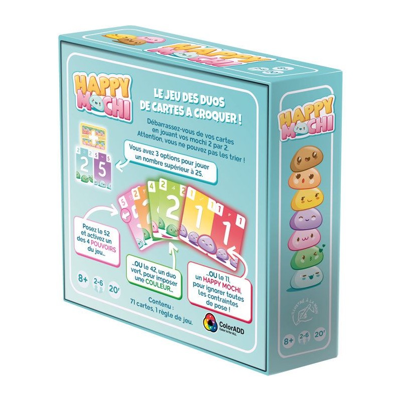 Jeu de cartes a croquer pour se débarrasser au plus vite de ses cartes, en respectant les valeurs indiquées. Chaque joueur reçoit 7 cartes qu'il ne peut pas classer et on place 2 cartes au centre de la table qui donne la valeur en cours. Chaque joueur a son tour, pioche une carte, qu'il place où il veut dans son jeu, ou joue un duo. Pour ce faire, on prend 2 cartes adjacentes de sa main pour recouvrir le duo central, en respectant les contraintes de valeur de la carte sens (inférieure ou supérieure) et de couleur. Si on joue 2 cartes de meme valeur, c'est un Happy Mochi, qui permet de jouer sans respecter les contraintes! Certaines cartes permettent de plus des actions spéciales, facultatives ou obligatoires. Des qu'un joueur n'a plus de carte, la manche s'arrete, chacun compte les points des cartes restantes en main. Le gagnant est celui qui a le moins de points. Un jeu tres agréable a jouer, facile a mettre en place, qui allie calcul, stratégie et hasard des cartes.Contenu: 70 cartes Mochi (5,6 x 8,7 cm), 1 carte Sens, regle, dans une boîte de format 3,6 x 11,4 x 11,4 cm.
