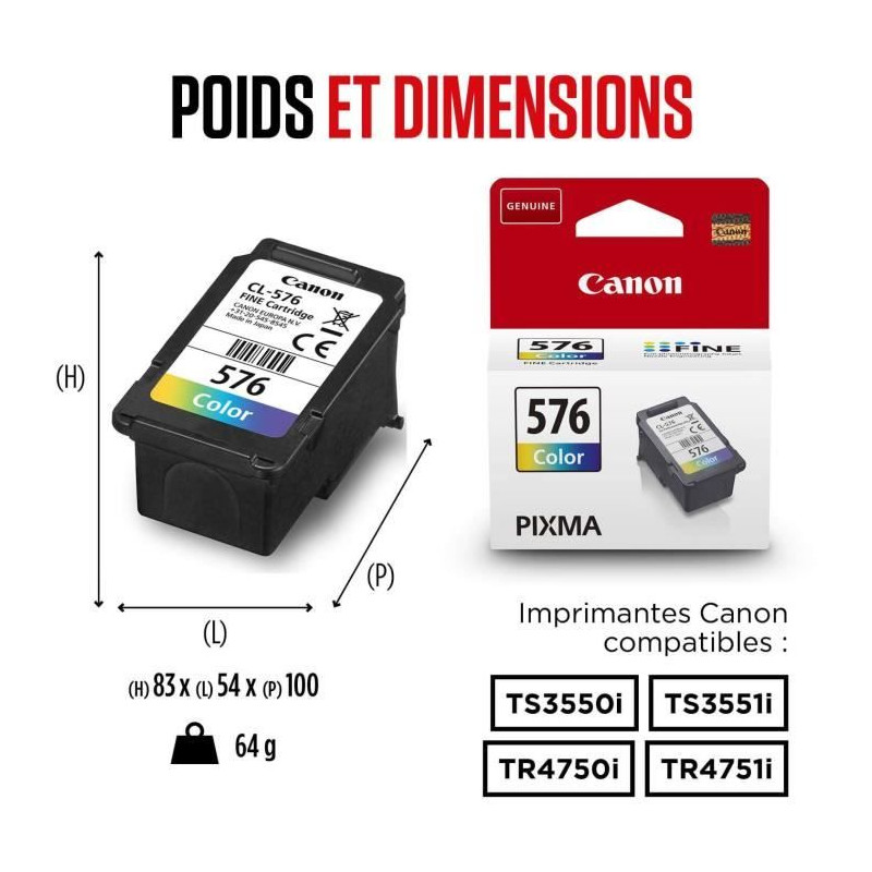 Cartouche d'encre CANON CL-576 - Multicolore - Rendement 100 pages - Produit d'origine