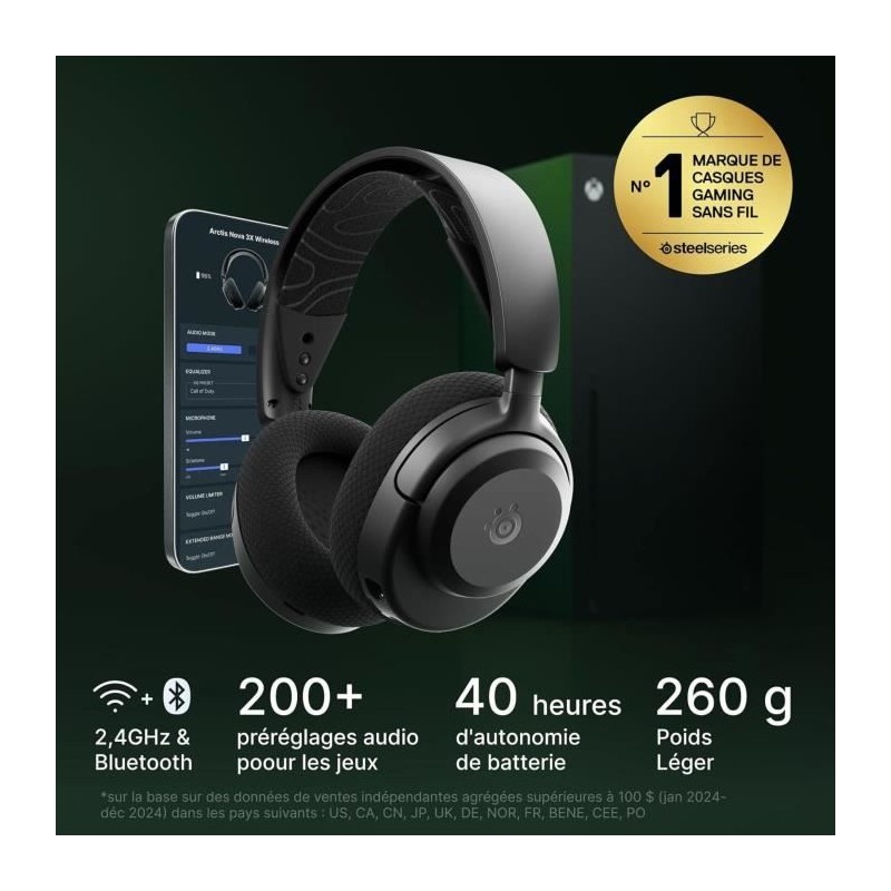 Le casque gaming sans fil STEELSERIES Arctis Nova 3XW offre jusqu'a 40 heures d'autonomie et une connexion 2,4 GHz pour une expérience de jeu immersive. Compatible avec Xbox, PC, PlayStation et plus, il dispose d'oreillettes en néodyme pour un son de qualité et d'une charge rapide optimisée.