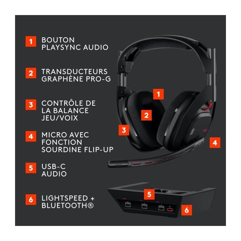 Casque gamer - Sans fil - Logitech G - Astro A50 Lightspeed Pro-G Graphene - Xbox, PS5, Switch, PC/Mac - Noir