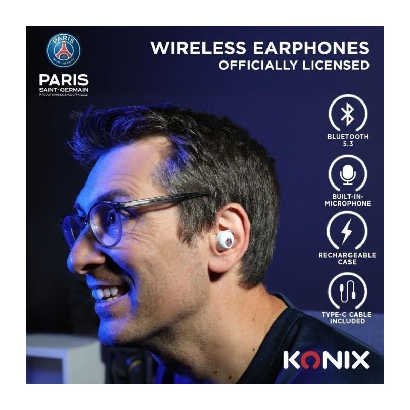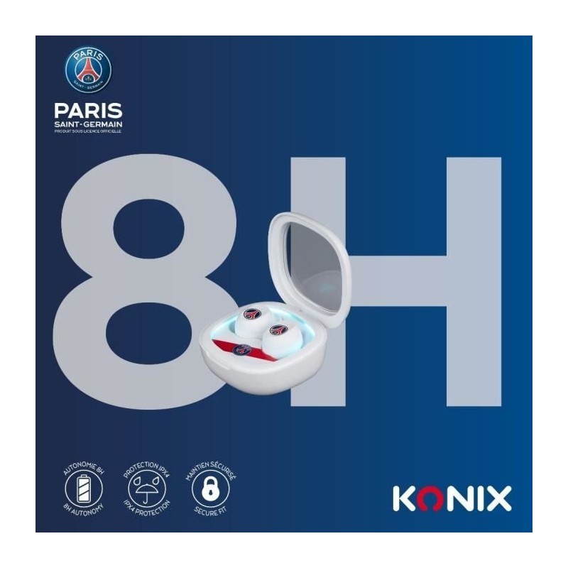 Écouteurs sans fil - KONIX - PSG - Autonomie 8 h + 15 h - IPX4 - Bluetooth - Blanc