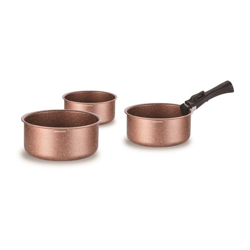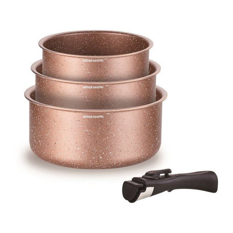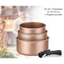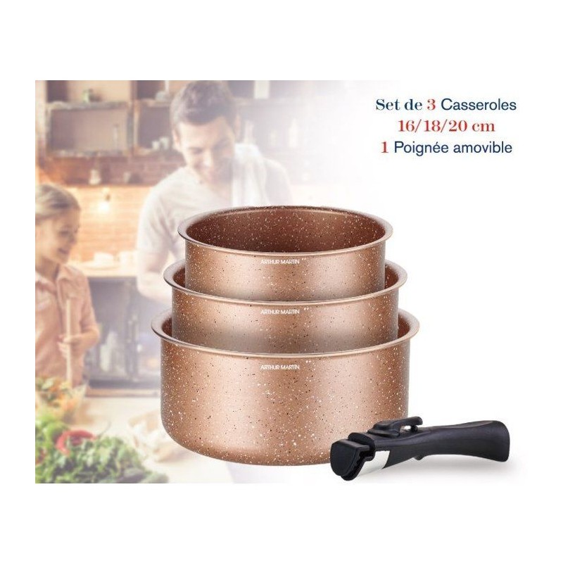 Set de 3 casseroles - Tous feux dont induction - ARTHUR MARTIN - AM2366 - Ø 16,18 et 20 cm + 1 poignée amovible - Terracotta