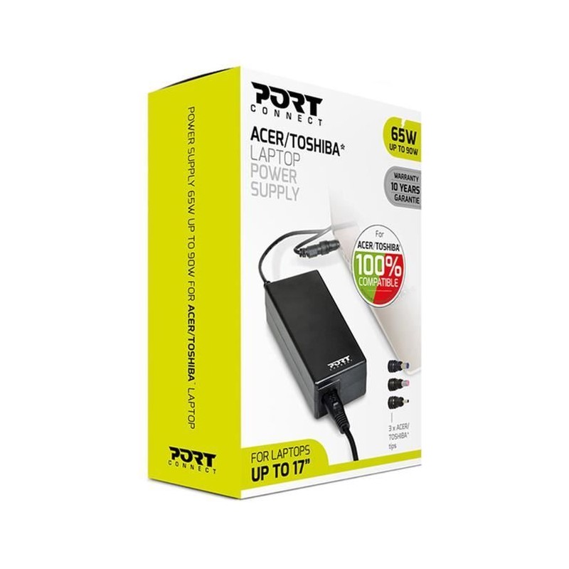 Cet adaptateur secteur PORT DESIGNS est compatible avec la plupart des Notebooks Acer/Toshiba jusqu'a 17''. Il a une tension requise de CA 100-240 V et un courant électrique max. de 65 W. Il est livré avec un câble de sortie CC de 1.8 metre de longueur. Sa couleur principale est noire et il pese 340 g.