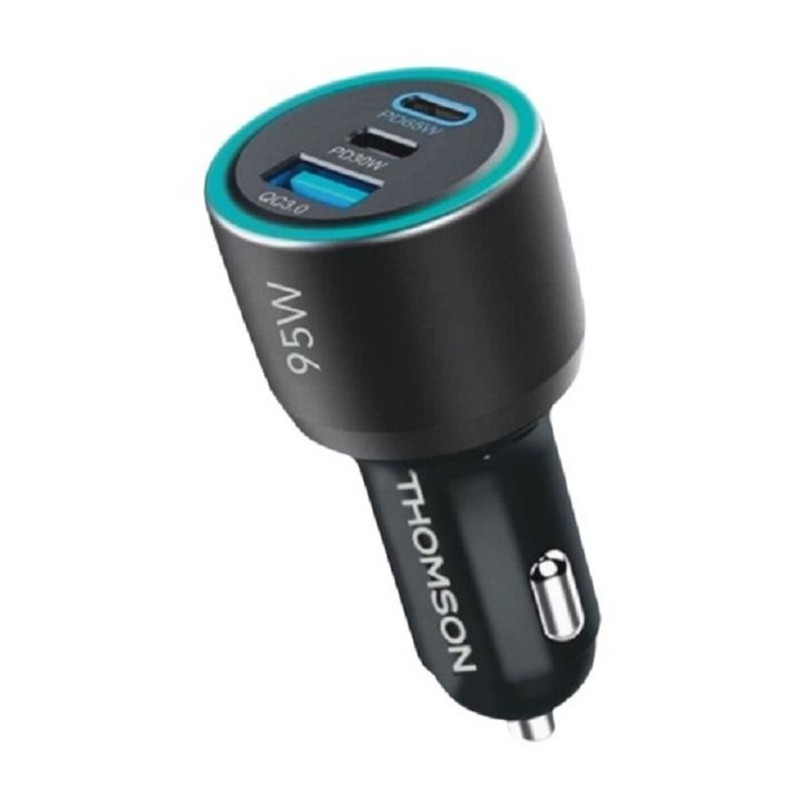 Découvrez le chargeur de voiture THOMSON 95 W, équipé de la technologie GaN nouvelle génération. Il dispose de 2 ports USB-C avec Power Delivery (PD) de 65 W et 30 W, ainsi qu'un port USB-A avec Quick Charge 3.0 pour une charge rapide et efficace de vos appareils.