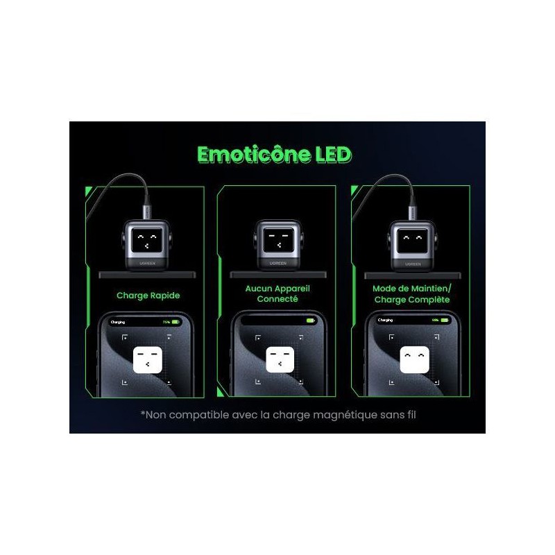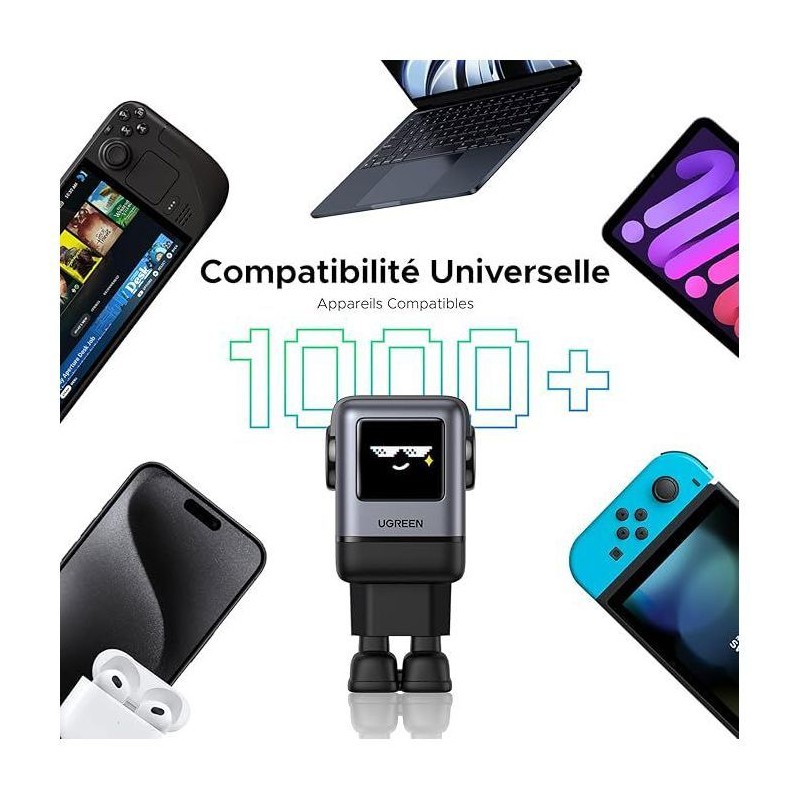 Le chargeur secteur UGREEN "robot" 4 ports 100W combine puissance et polyvalence. Avec quatre ports dont USB-C PD, il permet de recharger simultanément smartphones, tablettes et ordinateurs portables a haute vitesse. Son design unique et compact optimise l'organisation sur votre bureau, tout en restant élégant grâce a sa finition noire. Les protections intégrées contre la surchauffe, la surcharge et les courts-circuits assurent une utilisation sécurisée. Parfait pour les familles, les professionnels ou les voyageurs souhaitant un chargeur capable de répondre a tous leurs besoins simultanément.