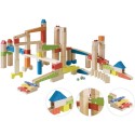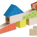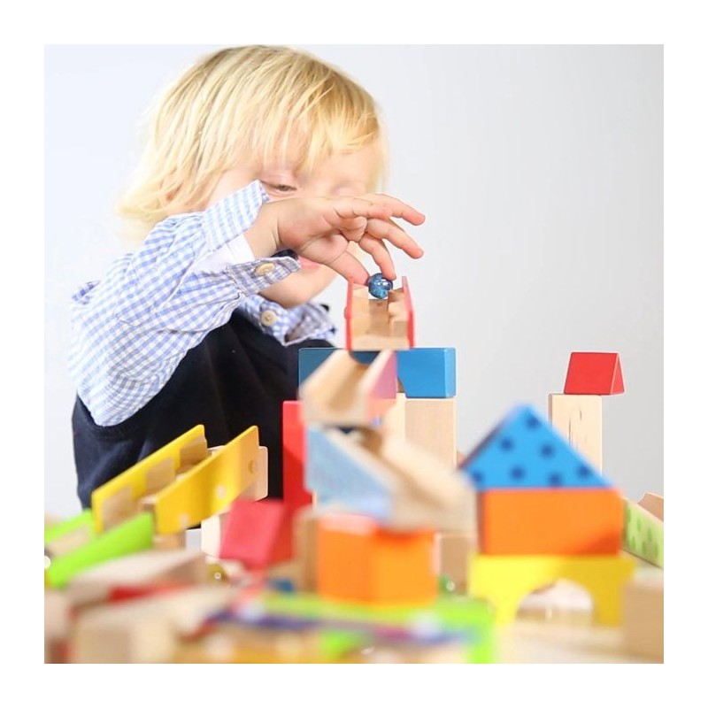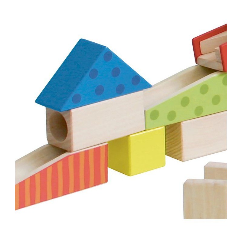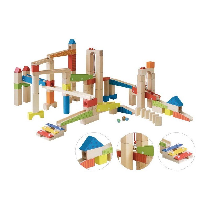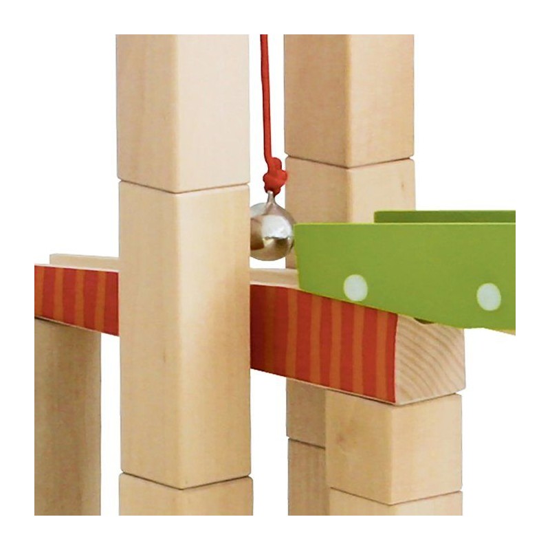 Circuit a billes en bois - ROBA - 20 billes en verre - 80 briques de construction - Naturel / Rouge / Bleu / Vert