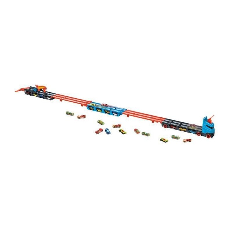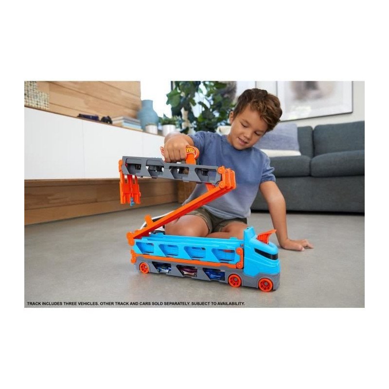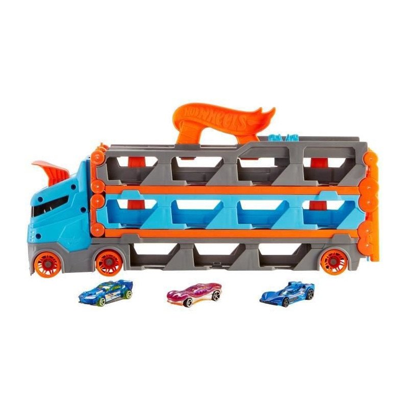 Le Super Transporteur Extensible Hot Wheels, fourni avec 3 véhicules, permet de nombreuses fonction alités et manieres de jouer ! Faites-le rouler et utilisez-le pour ranger jusqu'a 25 véhicules (vendus séparément).