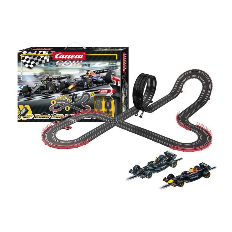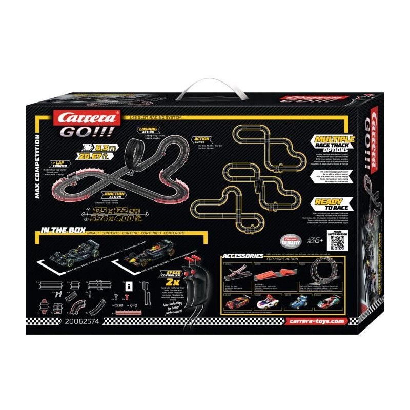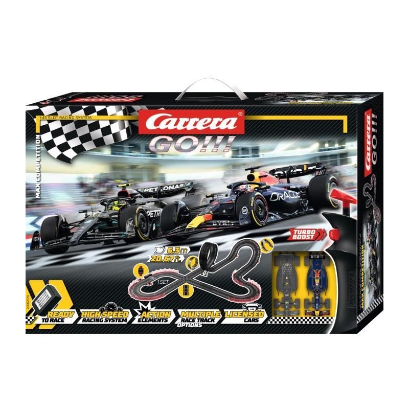 Vivez la compétition ultime avec le circuit de course CARRERA Max Competition, destiné aux enfants des 6 ans. Avec ses 6,3 metres de piste, ce circuit met en scene les voitures Mercedes-AMG F1 W14 E Performance de L. Hamilton et Oracle Red Bull Racing RB19 de M. Verstappen. Fonctionnant avec un transformateur, ce circuit est facile a connecter et a utiliser. Il comprend 2 manettes de vitesse, un compteur de tours, des lignes droites, des courbes, une jonction, un passage supérieur, une boucle, des garde-fous et des supports. Dimensions : 10,0 x 58,0 x 40,0 cm. Poids : 7,5 lbs / 3,4 kg.