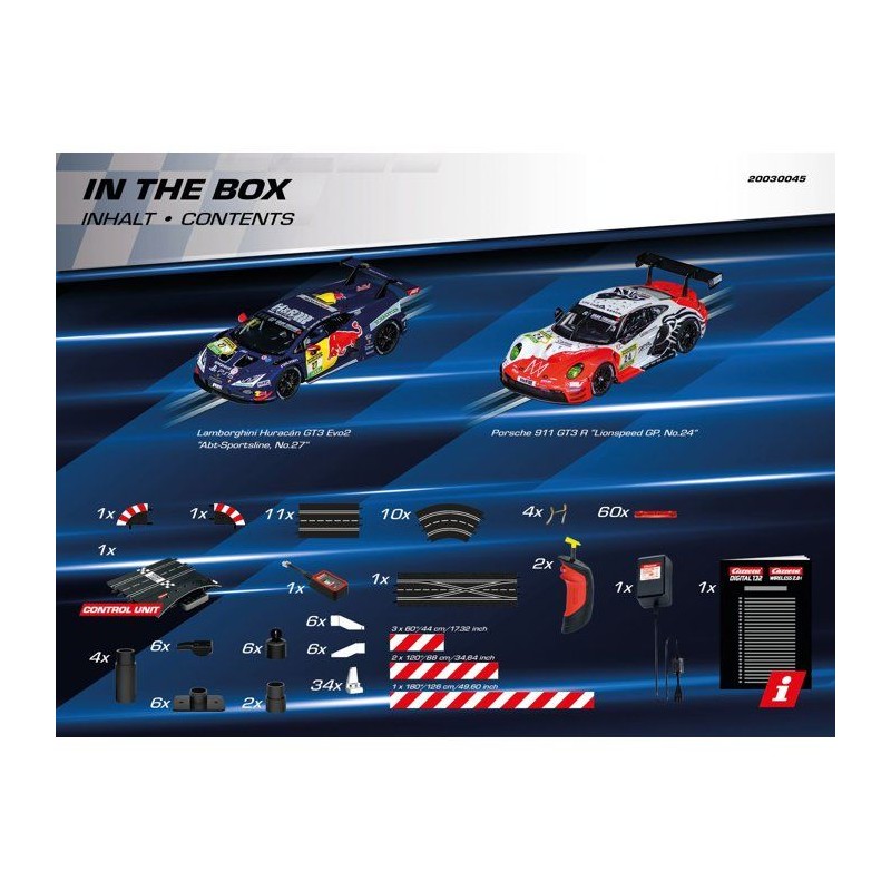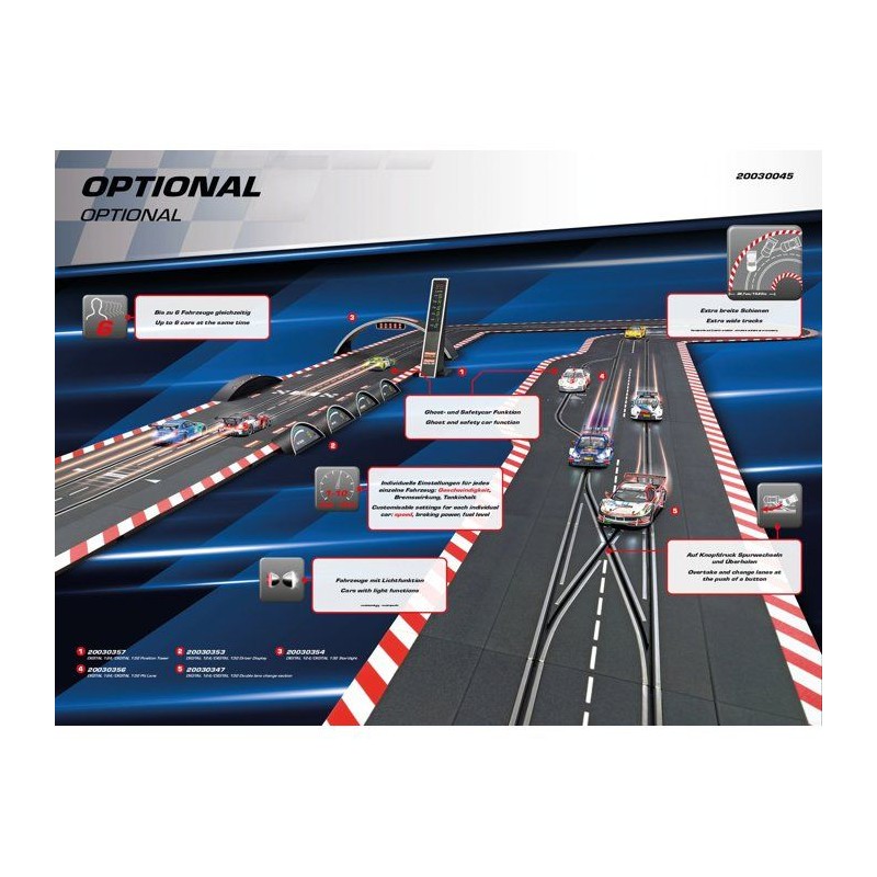 Un circuit Digital 132 dynamique avec gestion de freinage, puissance et vitesse. Changez de voie, doublez vos adversaires, affrontez une voiture fantôme et personnalisez votre style de conduite. Livré avec 2 voitures GT au 1/32e et compatible avec tous les kits d'extension Carrera.