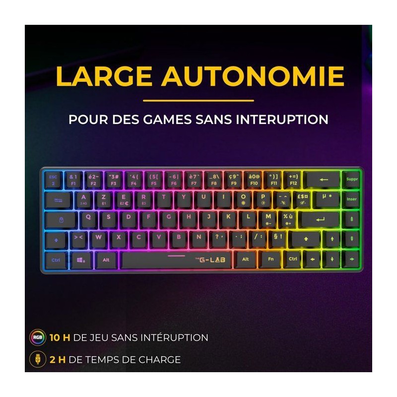 Compact, performant et sans fil, le KEYZ HYDROGEN de The G-Lab est le clavier idéal pour les setups gaming minimalistes. Son format 60% libere un maximum d'espace sur le bureau tout en offrant toutes les fonctions essentielles. La connexion sans fil assure une frappe fluide et réactive, parfaite pour jouer ou travailler sans contrainte de câble. Les touches a membrane, a la fois silencieuses et confortables, garantissent une excellente sensation de frappe meme lors de sessions prolongées. Son rétroéclairage RGB apporte un style moderne et améliore la lisibilité en ambiance sombre. Solide, polyvalent et compatible PC/console, ce clavier noir élégant s'integre facilement dans tous les environnements et offre une expérience de jeu tout en liberté.