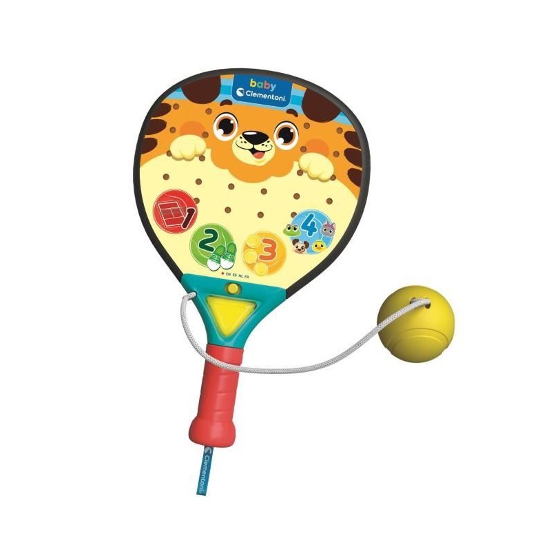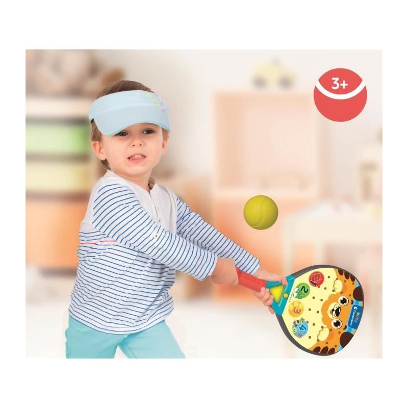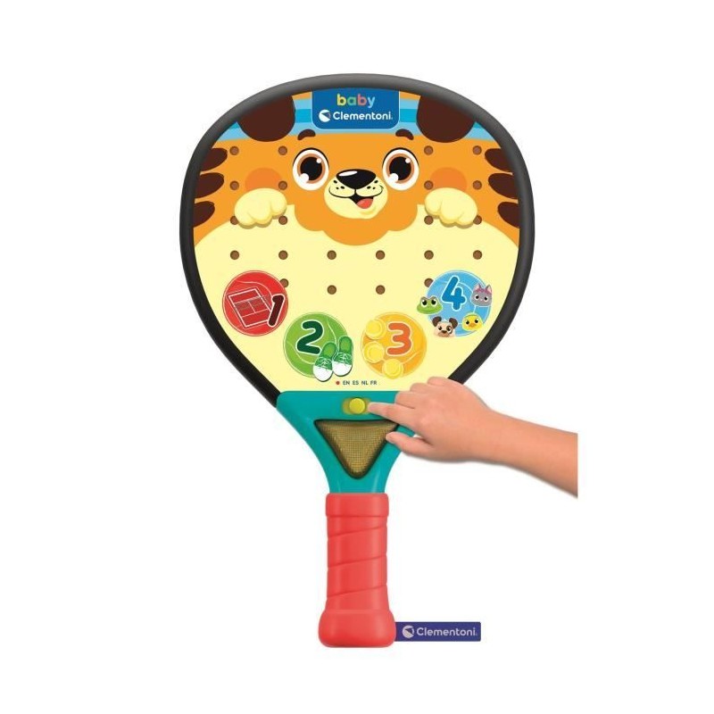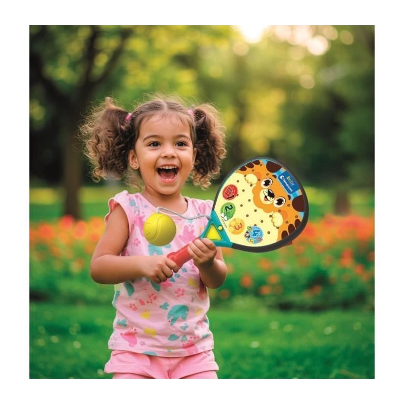 - Une raquette de padel spécialement conçue pour les tout-petits, avec une poignée et un contour en caoutchouc. - La membrane tactile active du contenu interactif et éducatif pour apprendre les premiers chiffres et des effets sonores amusants. - Avec des lumieres, des sons et des mélodies pour jouer en musique ! - La raquette détecte quand l'enfant la secoue !