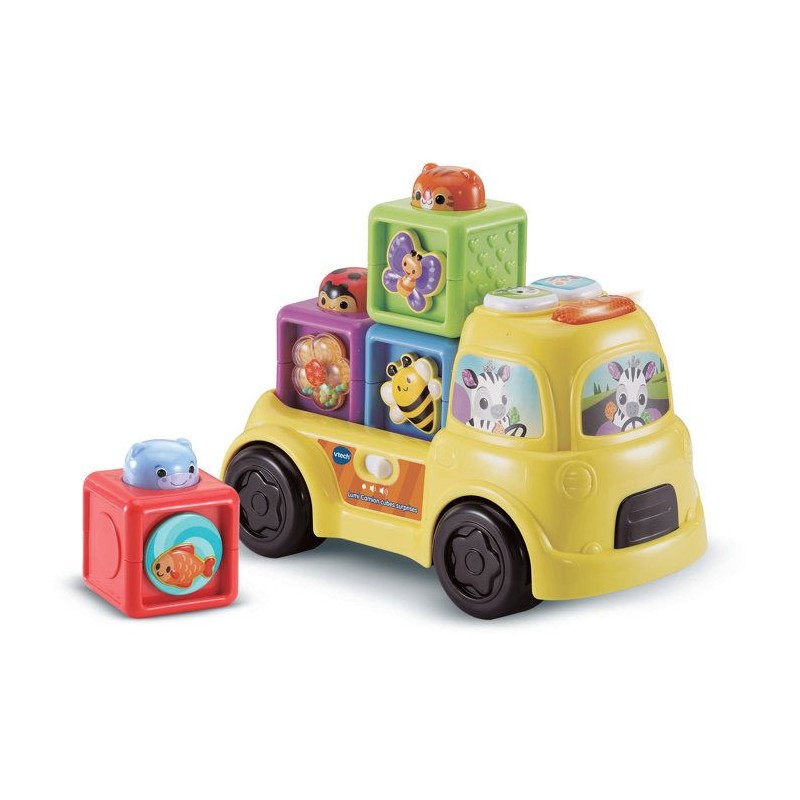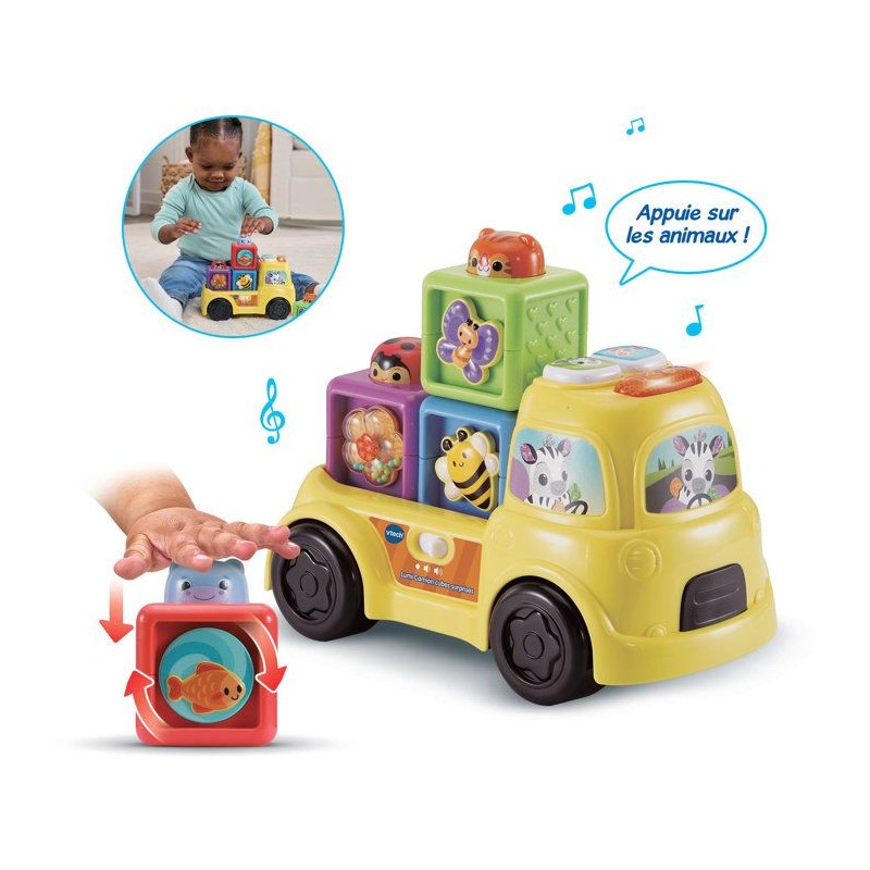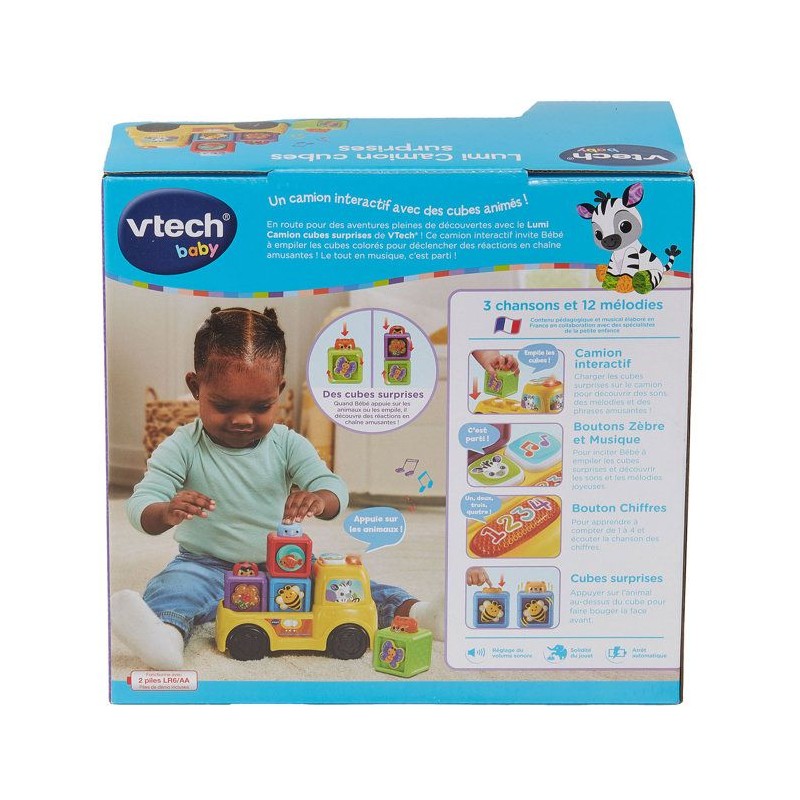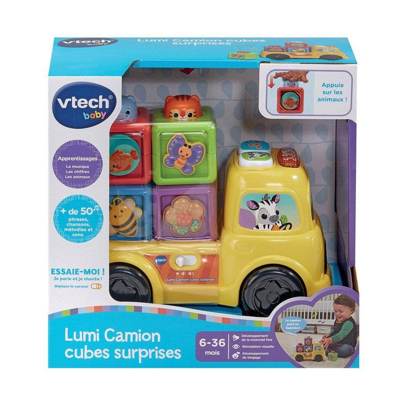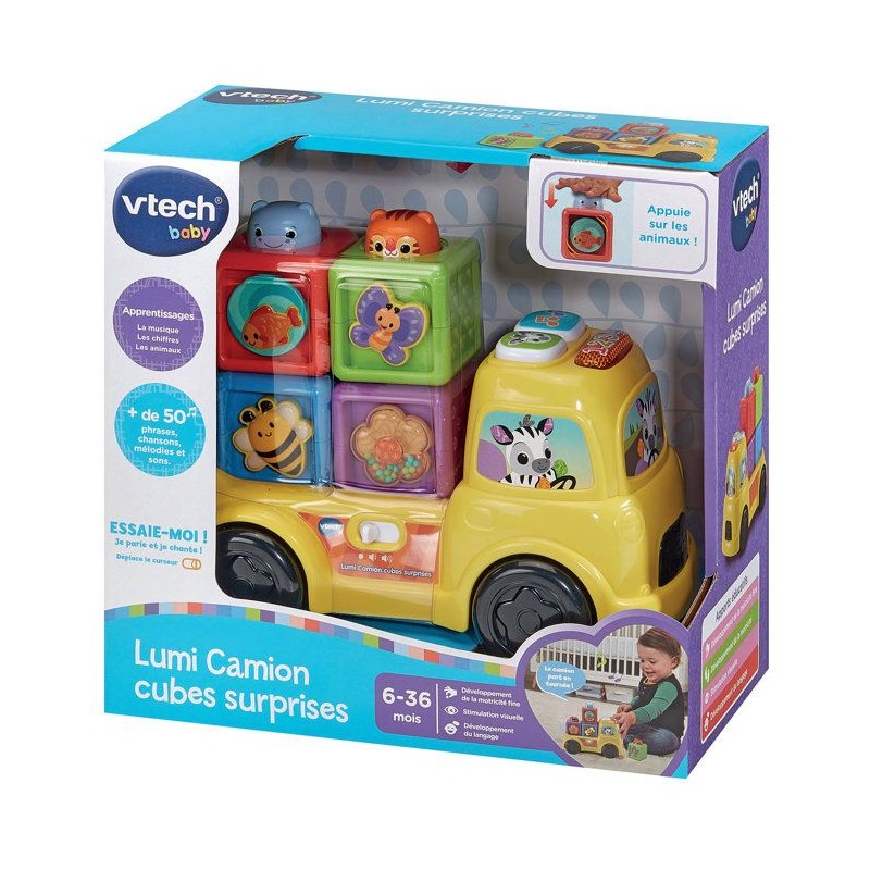 Lumi Camion Cubes Surprises - 6 - 36 mois Un camion et ses cubes colorés a empiler pour développer la motricité de Bébé de façon ludique Bébé s'amuse avec son camion ! Il le fait rouler, manipule les cubes, les empile et les range sur le plateau. 3 boutons interactifs avec effets sonores et lumineux. Le camion p