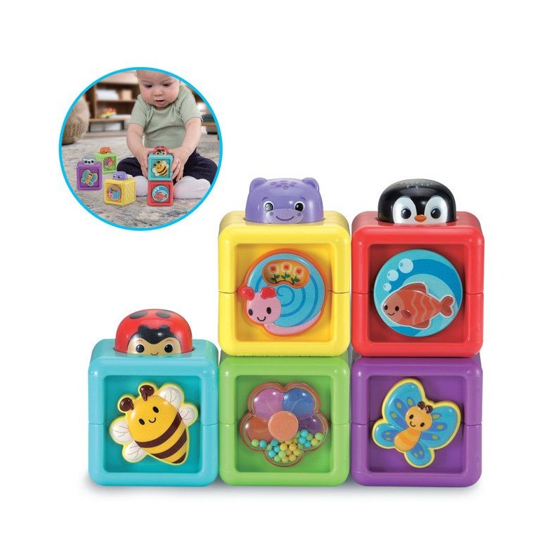 Cubes animaux surprises - 6 - 36 mois Bébé découvre les Cubes Animaux Surprises en les manipulant, les empilant et en explorant leurs nombreuses activités sensorielles. Chaque cube propose une surprise a toucher, tourner, secouer ou observer ! 5 cubes interactifs pour éveiller les sens : Un escargot a faire tourne