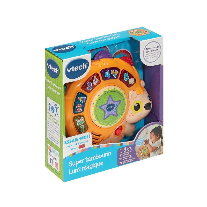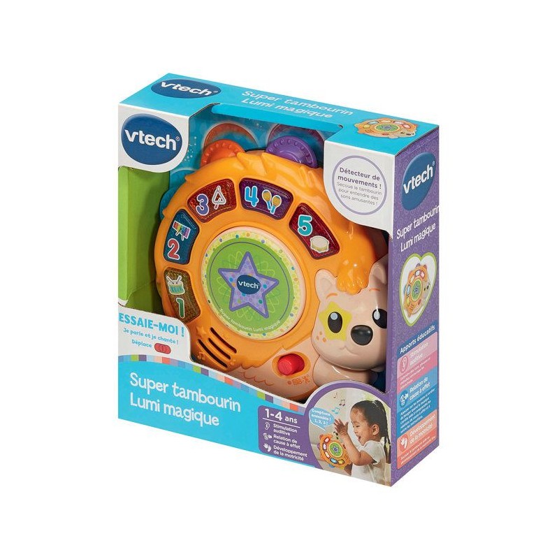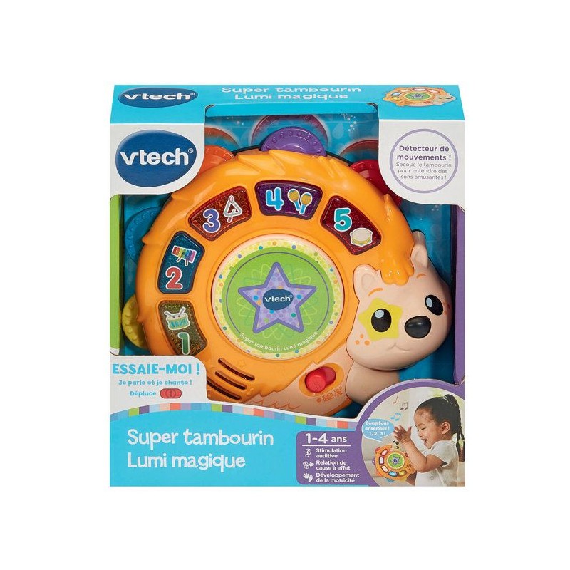 Super tambourin lumi magique - 1 - 4 ans Un jouet musical interactif pour apprendre en bougeant, comme les grands musiciens ! Avec ses 2 modes de jeu, l'enfant alterne entre apprentissage et fun en mouvement : En mode Apprentissage, il découvre les chiffres, les couleurs et les instruments de musique grâce aux 5 bo
