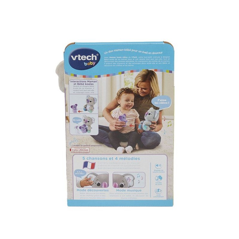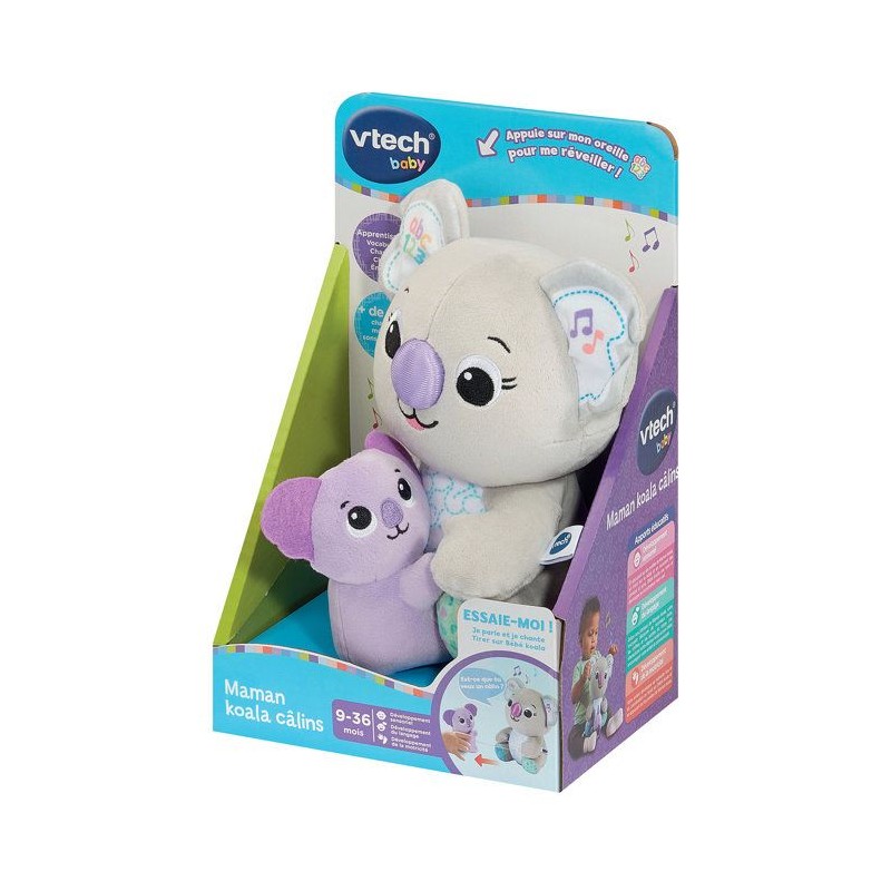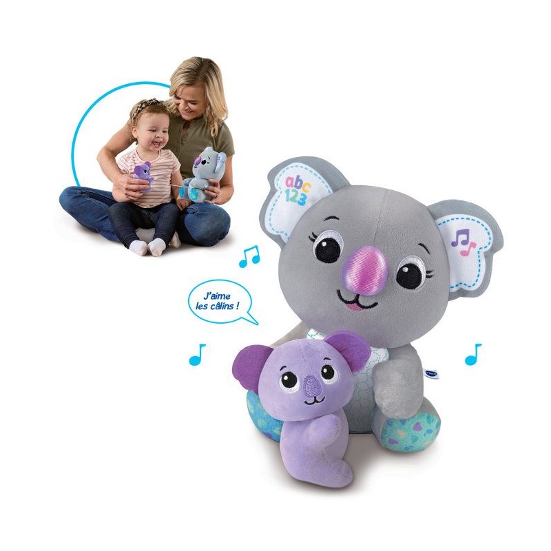 Maman koala câlins - 9 - 36 mois Un duo interactif tout doux pour apprendre et partager de tendres câlins ! Cette adorable maman koala tient son bébé dans les bras pour faire découvrir les lettres, les chiffres, les couleurs, les émotions et la musique grâce a ses oreilles interactives. Le bébé koala est attaché