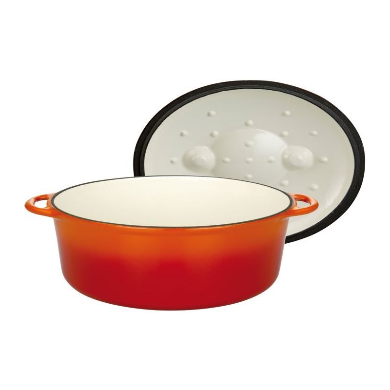 Faible consommation dénergie : fonte pour une répartition homogene et une distribution optimale de la chaleurExtérieur émaillé orange rouge, intérieur blanc émailléCouvercle spécial vapeur pour des rotis savoureux et juteuxTous feux dont induction Passe au four jusqua 240° C.