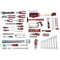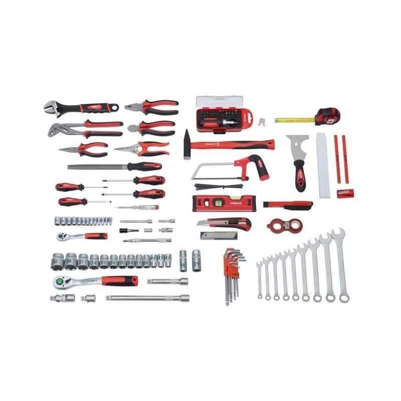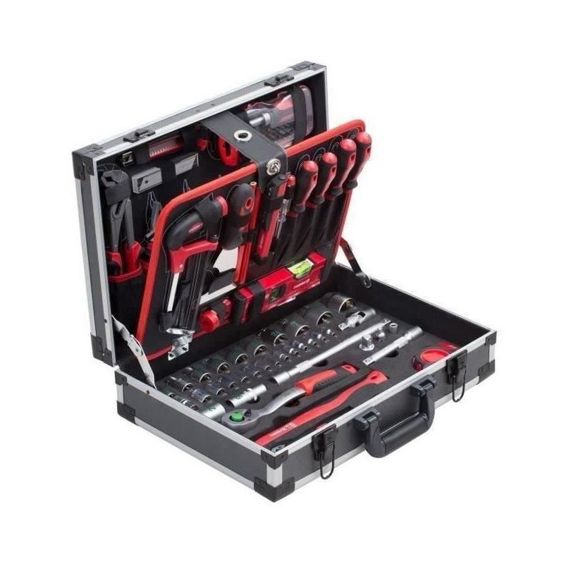 Contenu: pince plate - coupante - universelle - multiprise, cutter, 6 lames, 9 clés mixtes - 9 hexag, clé a molette, 2 tournevis - 2 PZ1 et PZ2, testeur de voltage, cisaille univ, tournevis réver, manche tournevis, couteau universel, scie mini, 5 lames de scie, 13 douilles, poignée a cliquet, 2 rallonges, cardan, adaptateur...