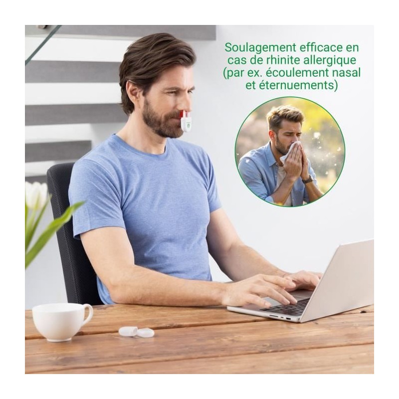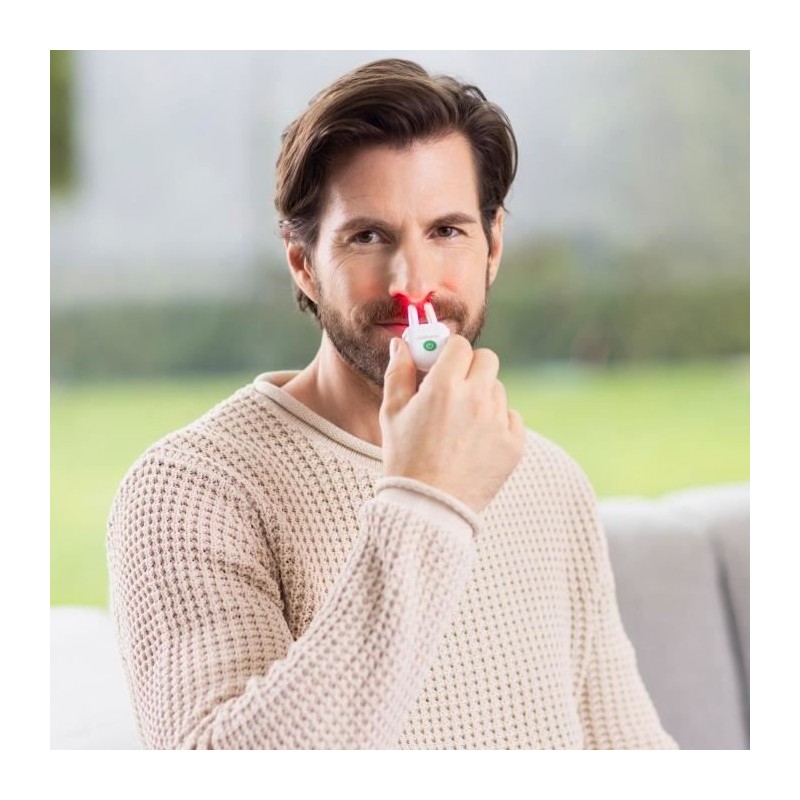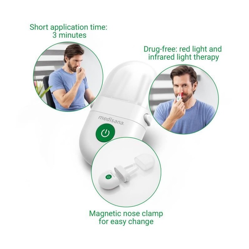 Dites adieu aux éternuements et nez qui coulent avec le MEDISANA Medinose Compact. Ce dispositif médical sans médicament utilise une thérapie par lumiere rouge et infrarouge pour soulager efficacement les symptômes de la rhinite allergique. En seulement 3 minutes, il réduit l'inflammation, stimule la circulation nasale et inhibe la libération d'histamine. Compact, léger et sans fil, il s'utilise facilement grâce a son bouton unique. Livré avec couvercle, capuchon de protection et piles CR2032 incluses, il est idéal pour un usage quotidien a la maison ou en déplacement.