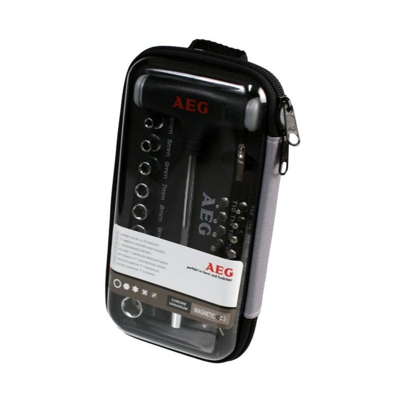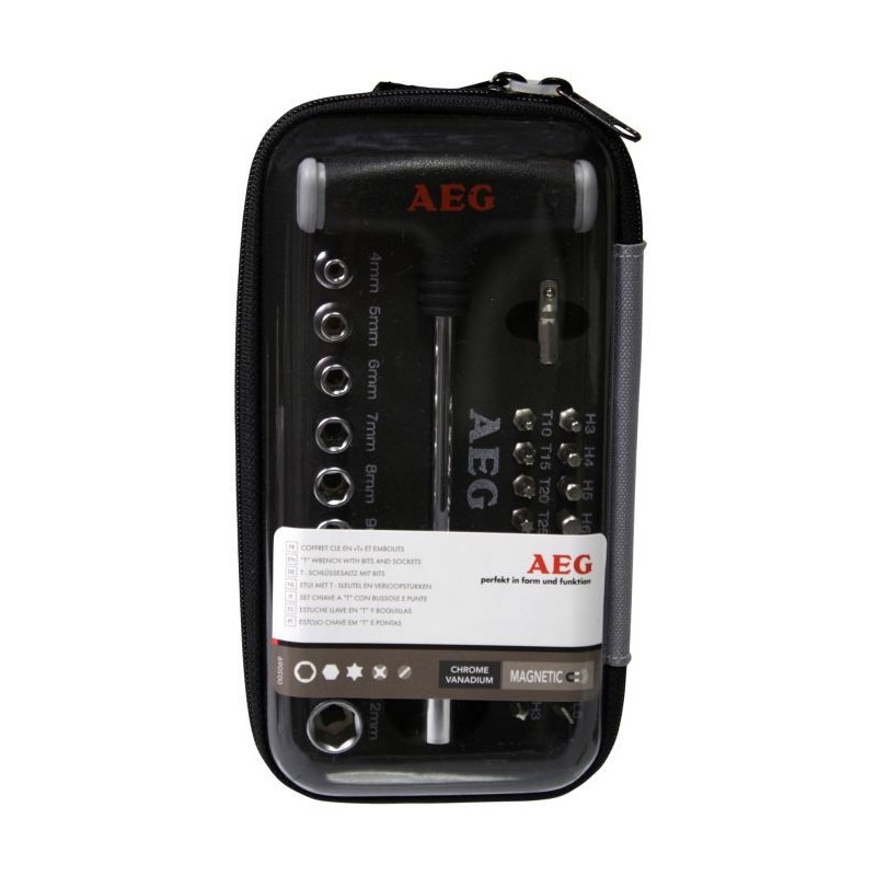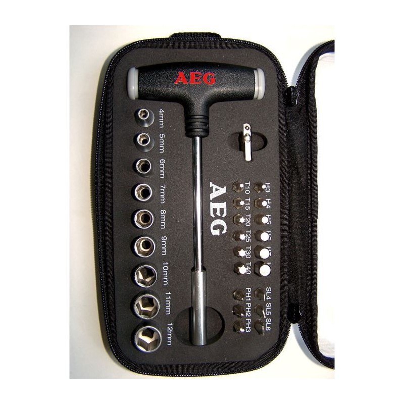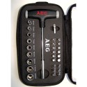 Coffret clé en T avec large choix d'embouts et de douilles. Livré dans un coffret antichoc. Fermeture fiable par zip. La clé et les accessoires sont fixés sur un support incassable en mousse haute densité.