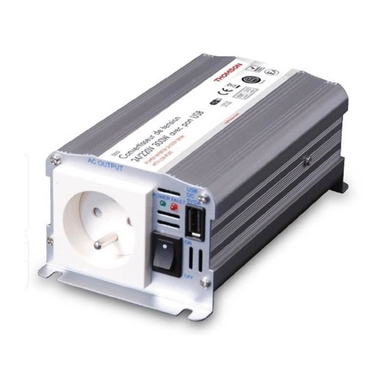 Convertisseur de tension THOMSON 24/220 V avec une puissance de 300 W et une prise USB pour recharger vos appareils.