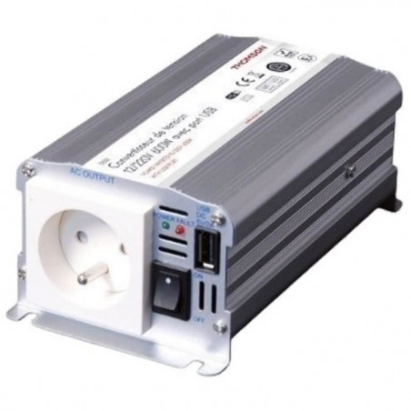 Convertisseur de tension THOMSON 12/220 V avec une puissance de 600 W et une prise USB pour recharger vos appareils.