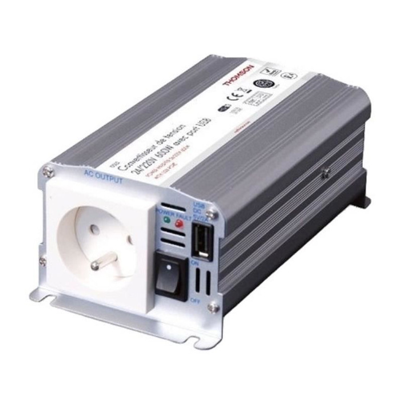 Convertisseur de tension THOMSON 24/220 V avec une puissance de 600 W et une prise USB pour recharger vos appareils.