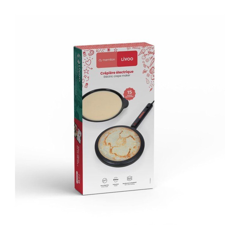 Offrez-vous la crepiere électrique Livoo x Marmiton DOP258CO pour des crepes parfaites a chaque fois ! Compacte et pratique, elle dispose d'une puissance de 600 W et d'une plaque Ø 20 cm avec revetement antiadhésif pour une cuisson homogene et sans accroche. Son thermostat automatique et ses témoins lumineux indiquent le fonctionnement et la température idéale. Bonus exclusif : 15 recettes Marmiton accessibles via un QR code sur l'appareil pour varier les plaisirs ! Sa poignée thermorésistante assure une manipulation sécurisée. Design noir moderne pour s'intégrer facilement dans votre cuisine. Idéale pour des crepes maison rapides et savoureuses, en toute simplicité !
