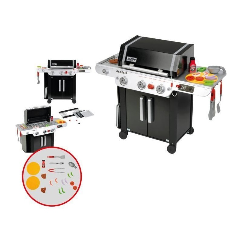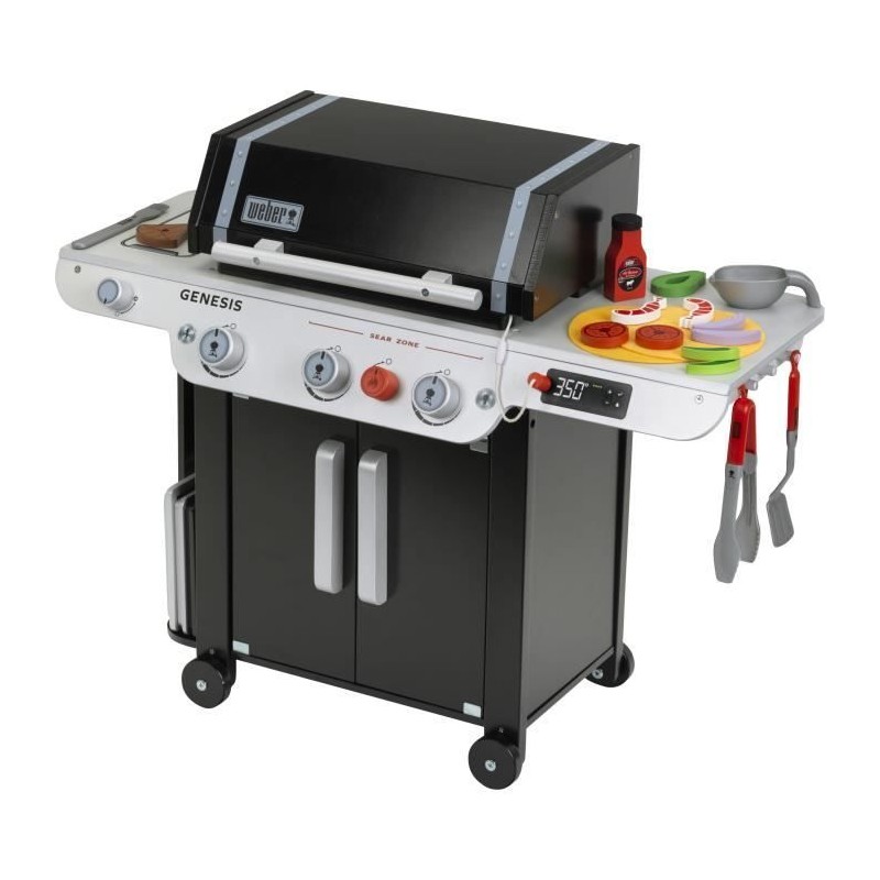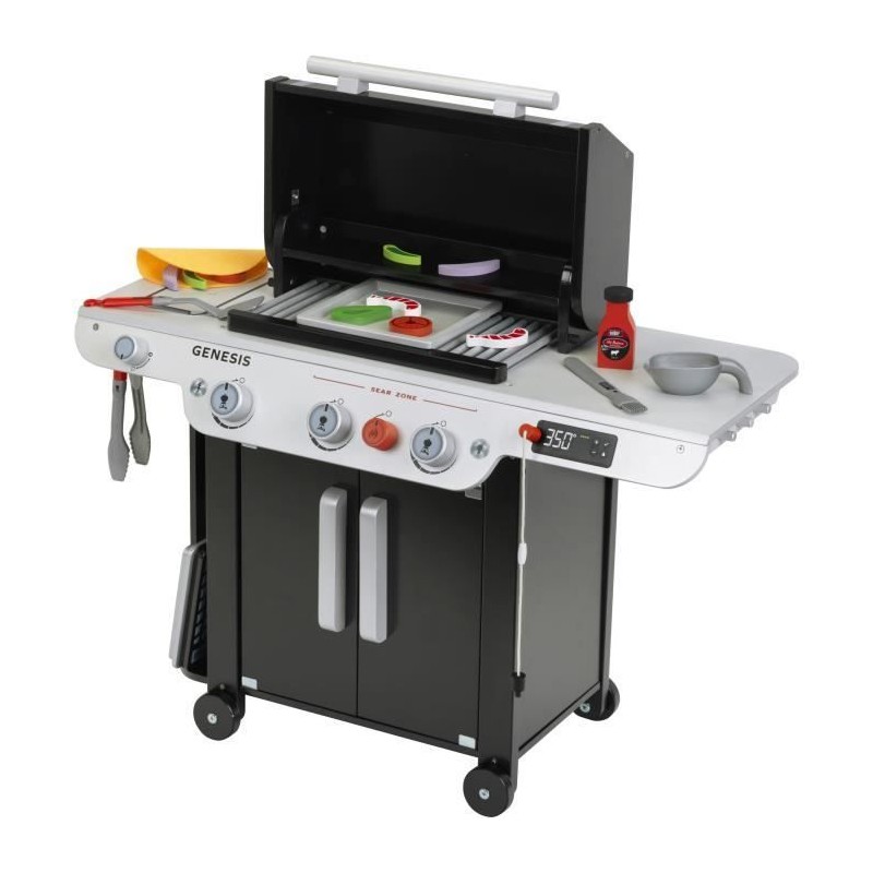 Offrez aux enfants une expérience de jeu absolument unique avec ce magnifique barbecue Weber Genesis - solide et tres stable - en bois certifié FSC ! Reproduction fidele du modele original, il comporte un large espace de cuisson (avec grille, plancha, etc.), un grand couvercle avec poignée, un espace de rangement avec deux portes, deux plans de travail, des petites roulettes pour pouvoir etre déplacé facilement et des crochets pour suspendre les ustensiles. Il est livré avec de nombreux accessoires indispensables pour cuisiner et préparer de bons petits plats : spatule, pince, pinceau, sauciere, sauce, aliments factices (steaks, tomates, crevettes, etc.). Dimensions du barbecue monté : 74 x 32,8 x 59,7 cm. A partir de 3 ans.