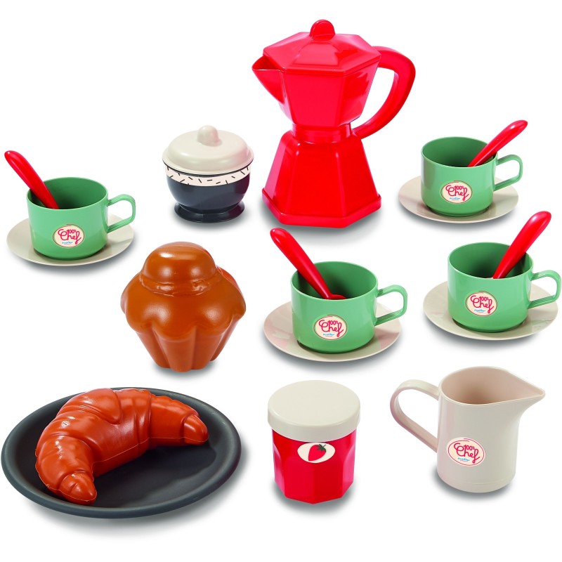 Commencez la journée avec un délicieux petit déjeuner grâce a cette desserte complete ! Elle comprend 4 tasses, sous-tasses et cuilleres, une cafetiere a l'italienne, un sucrier, un pot a lait, un pot a confiture, une assiette et deux viennoiseries. Un moment gourmand des 18 mois.