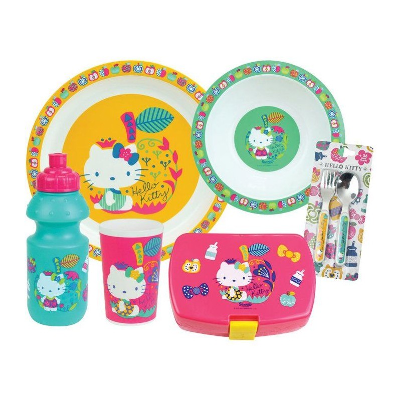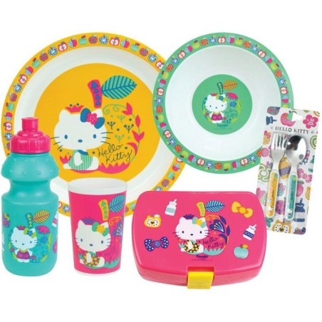 Lot vaisselle - FUN HOUSE - HELLO KITTY - Verre, Assiette creuse Ø16 cm, Asiette Ø22 cm, Couverts, Gourde, Boîte a goûter