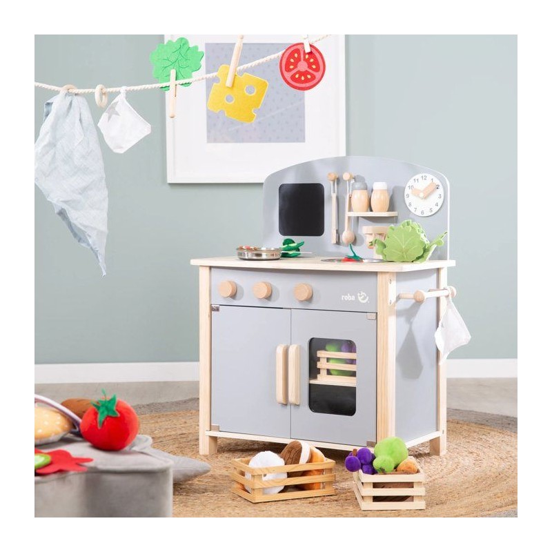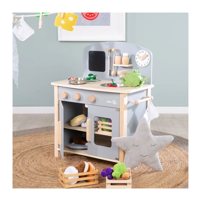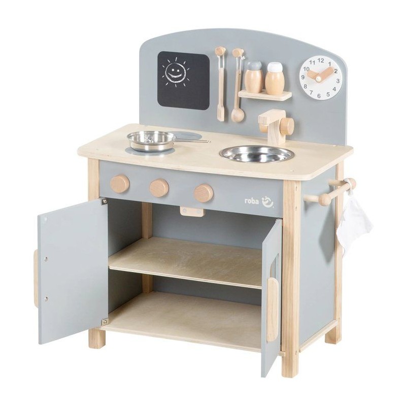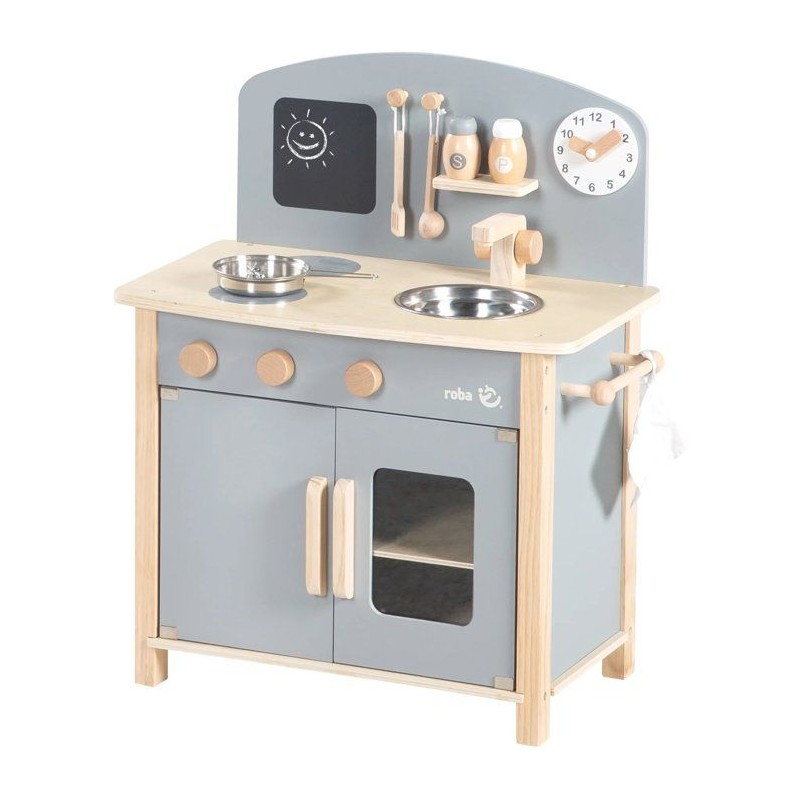 Cuisine enfant en bois - ROBA - Avec plaque de cuisson, four, évier, accessoires et horloge - Gris / Naturel