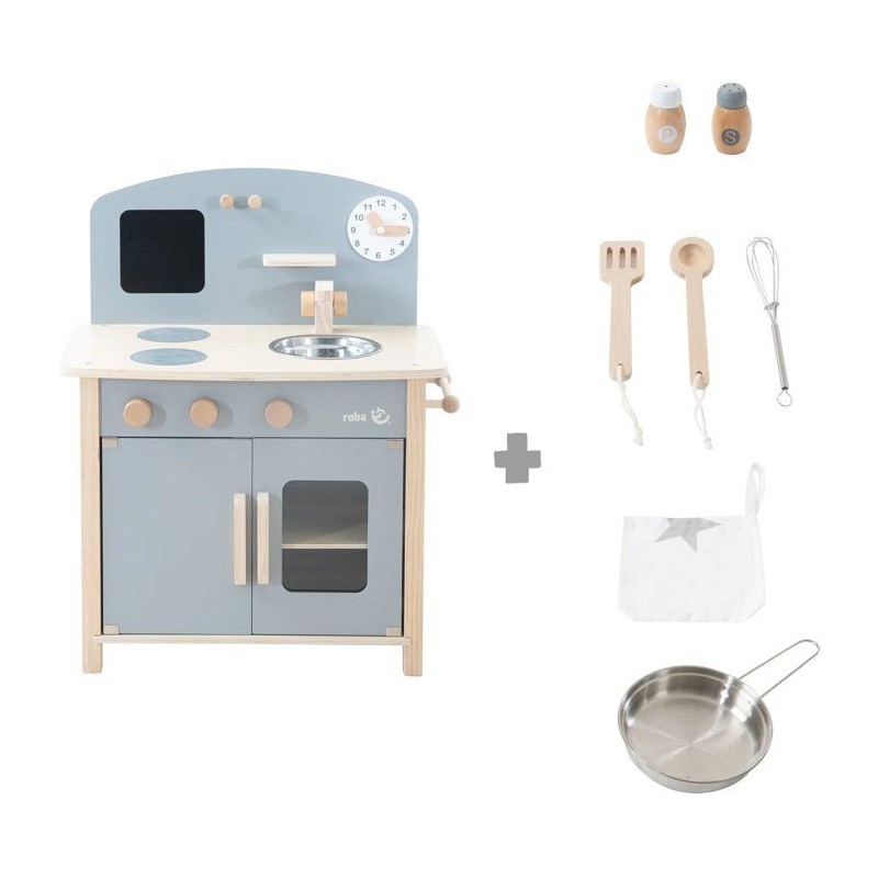 Invitez vos petits chefs en herbe a découvrir le plaisir de cuisiner avec la cuisine de jeu roba, un cadeau parfait pour éveiller leur imagination et développer leurs compétences ! Caractéristiques : Cuisine de jeu aux couleurs douces, idéale pour grandes et petites chambres Équipée d'une plaque de cuisson a deux feux, d'un four avec porte fonctionnelle, et d'un placard de rangement Évier avec robinet a deux boutons décoratifs et barre pour suspendre le torchon inclus Inclus : 7 accessoires (casserole en métal, fouet, cuillere de cuisine, spatule, torchon, saliere, poivriere) Horloge avec aiguilles rotatives pour apprendre a lire l'heure en s'amusant Petite étagere et deux pateres pour accrocher les ustensiles inclus Coins arrondis et peinture non-toxique pour une sécurité maximale Adaptée aux enfants a partir de 3 ans, développée selon la norme EN 71 Développé en Allemagne conformément aux normes européennes pour les jouets EN 71-1:2014 Conçue avec des matériaux sûrs, testés contre les substances nocives Composition : Côtés : MDF (laqué)_x000B_Planches : contreplaqué_x000B_Boutons : bois massif Avertissements de sécurité : ATTENTION! Ne convient pas aux enfants de moins de 36 mois. AVERTISSEMENT : Ne jamais laisser l'enfant sans surveillance. Montage requis par un adulte Conseils d'entretien : Nettoyer avec un chiffon humide Poids et dimensions L x P x H : 52,0 x 30,0 x 63,0 cm_x000B_6.30 kg Garantie : 24 mois