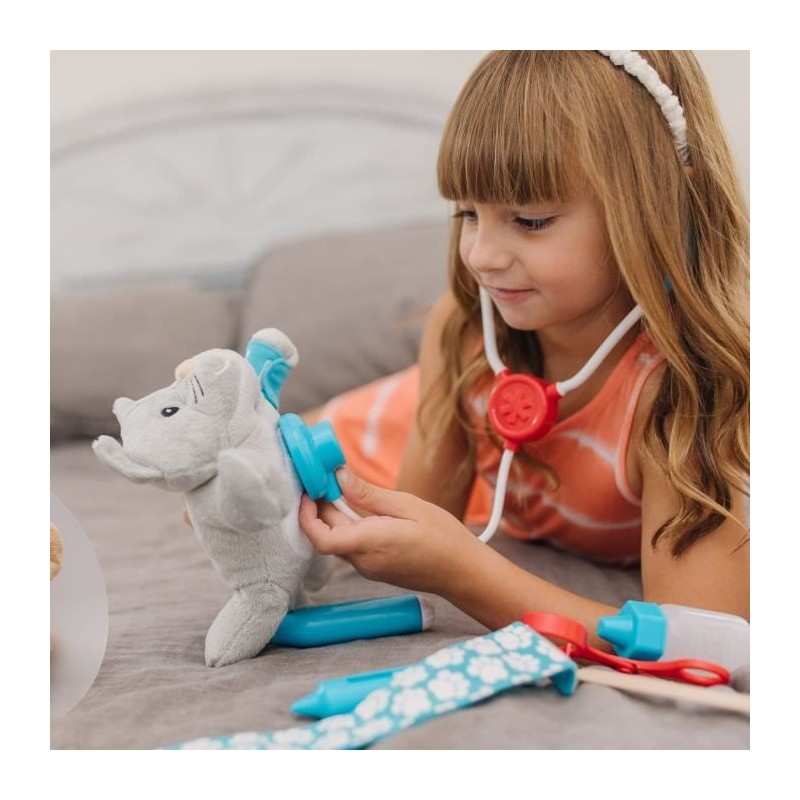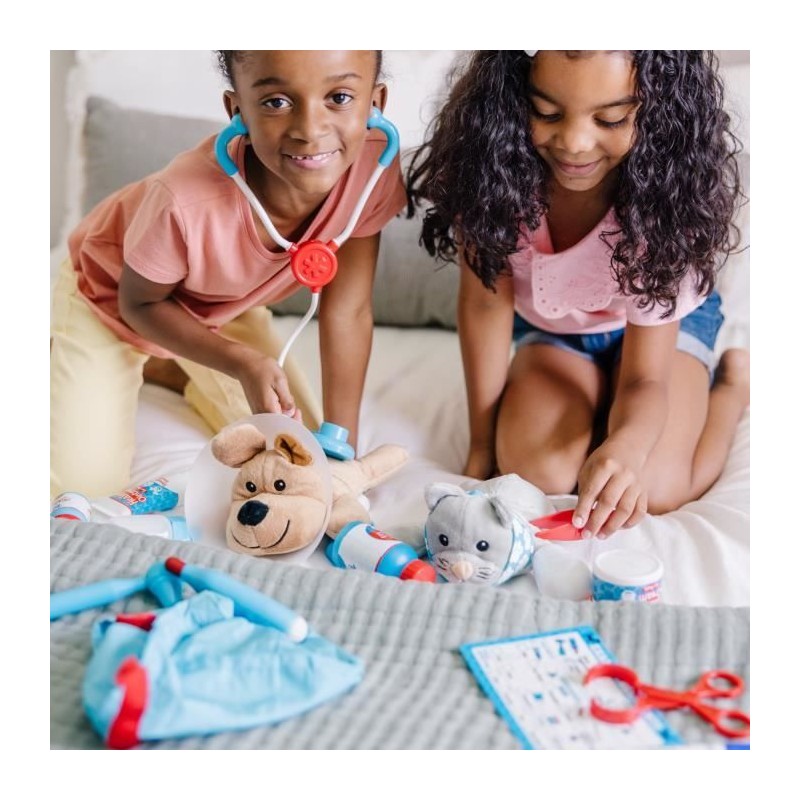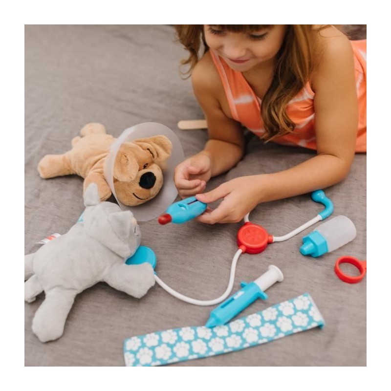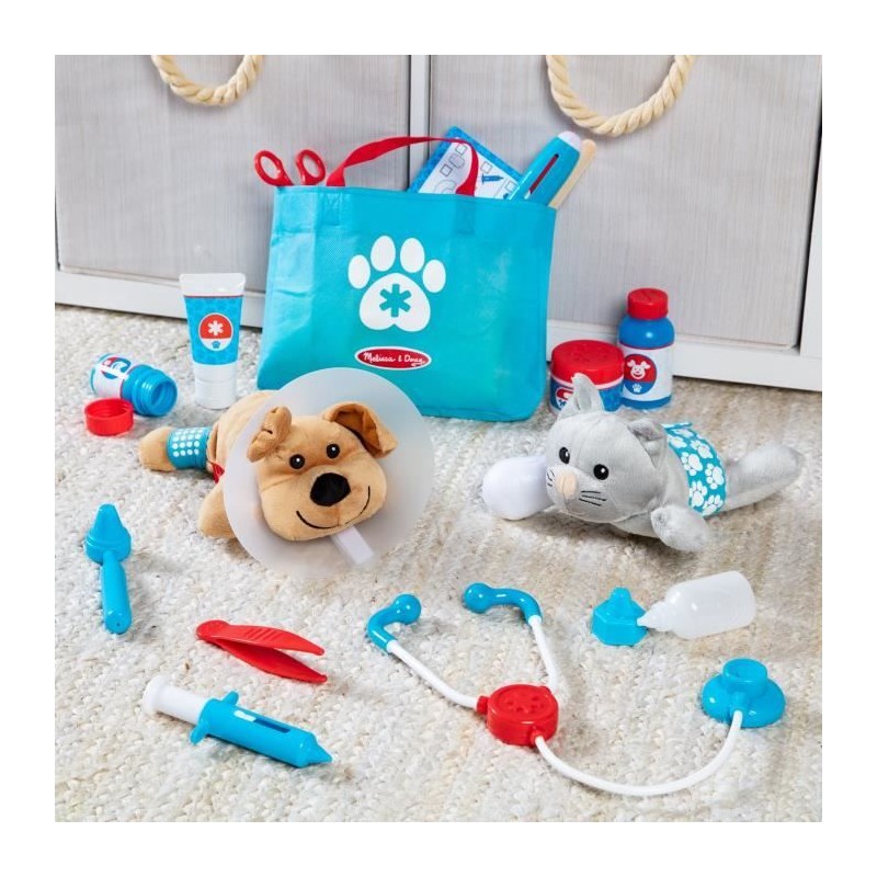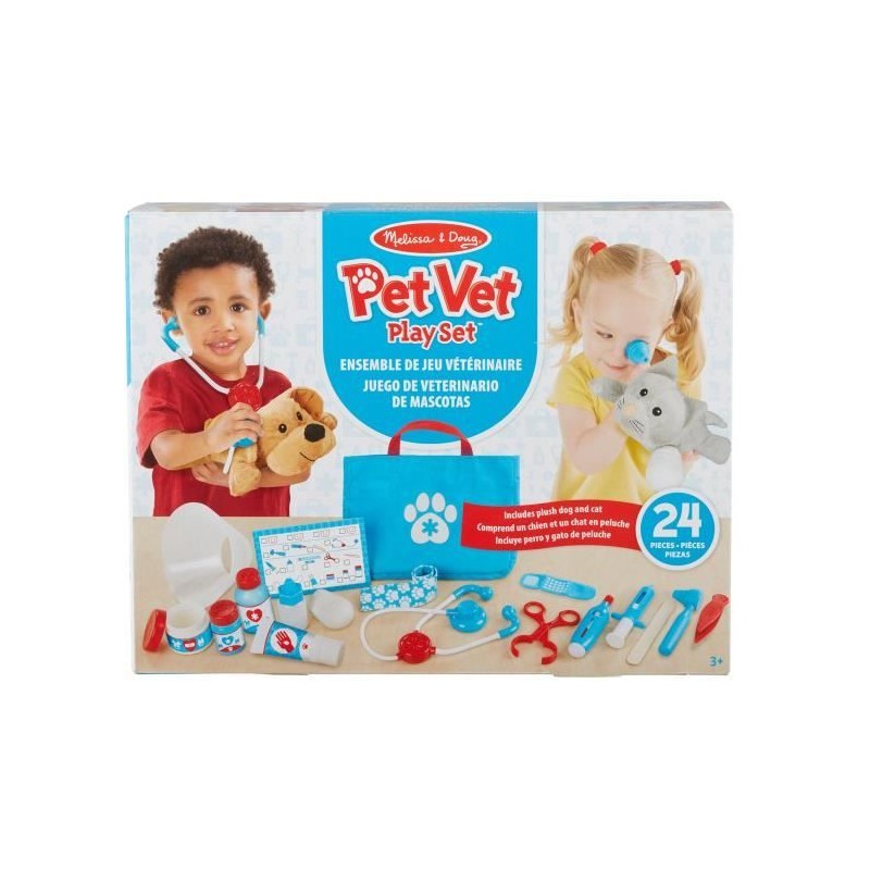 Coffret imitation de 24 pieces avec un chien et un chat en peluche, un équipement médical vétérinaire et un sac fourre-tout pour un rangement facile. Des 3 ans.