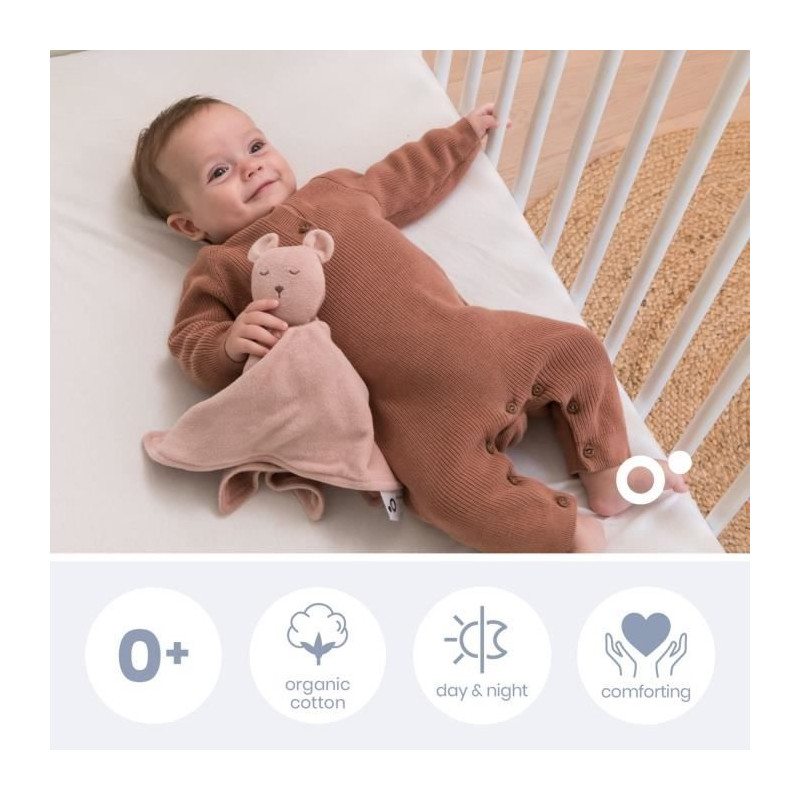 Assure une présence réconfortante aupres de bébé - Fourni avec 2 corps, pratique pour laver le doudou - Doudou chargé de l'odeur du parent - Bi-matiere : Gaze de coton et éponge organique ultra doux - 2 tetes d'animaux : rituel jour/nuit - Dimension idéale - Cotton organique & doux - Certifié oeko-tex et GOTS