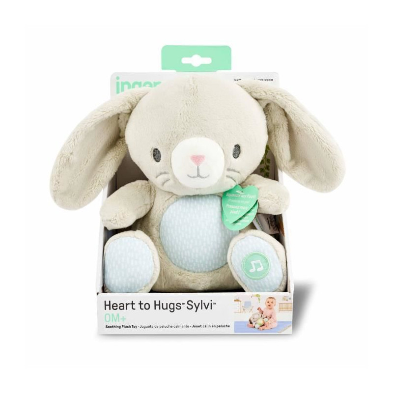 De gros câlins et des sons de battement de coeur a portée de la main avec ce jouet peluche adorable Heart to Hugs(TM) Sylvi(TM) d'Ingenuity(TM). Bébé est calme et heureux et se balance au rythme des battement de votre coeur pendant 15 minutes et plus, avec chansonnettes, vibrations et lumieres clignotantes. Le ventre de Sylvi le petit lapin clignote avec des lumieres douces et amuse bébé qui grandit. Votre bout de chou fait fonctionner les lumieres et sons en secouant le jouet ou en appuyant sur le pied de Sylvi développement des capacités motrices globales. 2 modes au choix : jeu continu pendant pres de 15 minutes ou petites séances de vibration, lumieres et sons. Ce doudou petit lapin rembourré est compact (23,11 cm (H) x 24,13 cm (L) x 10,41 cm (P)) a emporter partout avec vous, bébé grandit et passe de la petite enfance a l'âge des grands. Un cadeau idéal a cajoler pendant les vacances ou offrir pour les fetes prénatales. Compartiment piles cachés pour une plus grande sécurité enfant.
