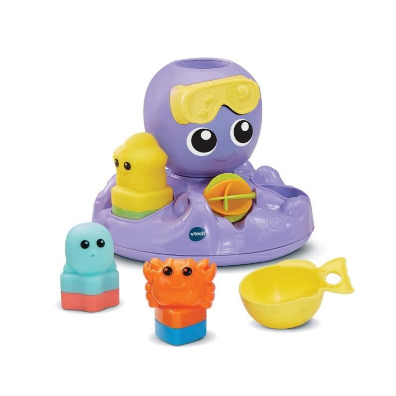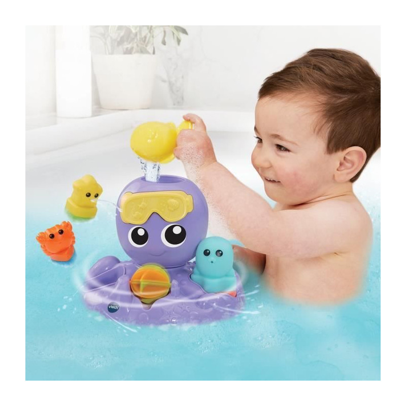 Julie, ma pieuvre toupie de bain - 1 - 5 ans Une toupie Pieuvre et ses 4 accessoires pour amuser et éclabousser Bébé pendant le bain ! Julie, la pieuvre toupie est un jouet de bain trop rigolo ! Lorsque Bébé met de l'eau sur sa tete grâce au verseur Poisson, elle se met a tourner comme une toupie pour amuser Bébé ! Elle crée ainsi des mouvements dans l'eau et permet a Bébé de comprendre la relation de cause a effet. Elle est accompagnée de 3 Animaux Formes avec gicleur pour prolonger le jeu. Et pour encore plus de découvertes, la pieuvre possede 3 emplacements Formes pour que Bébé s'amuse a trier les animaux et les replacer au bon endroit. Jouet non-électronique.