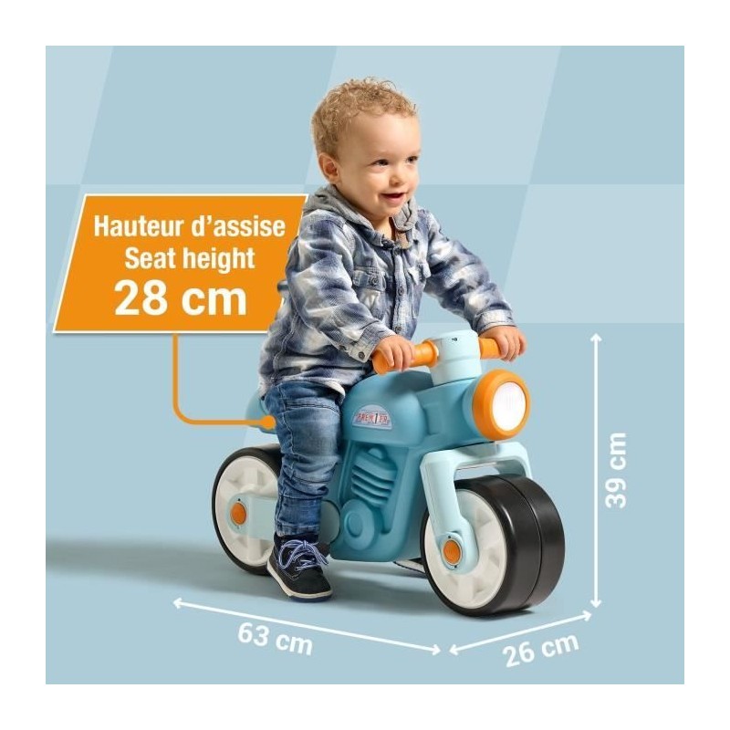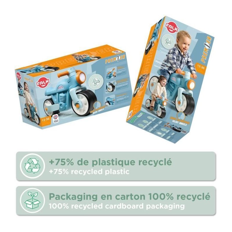Une moto pleine d'audace avec son design rétro et moderne a la fois. Elle est 100% fabriquée en France a partir de 75% de plastique recyclé. Chez Falk, préserver l'environnement s'apprend des les premiers pas de nos enfants ! Avec ses larges roues silencieuses et antidérapantes, elle apporte également la stabilité nécessaire a votre enfant pour lui permettre de développer son équilibre et sa motricité en toute sécurité. Ses roues ne laissent pas de marques sur le sol ce qui la rend parfaitement adaptée a un usage en intérieur comme en extérieur.