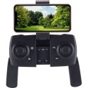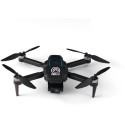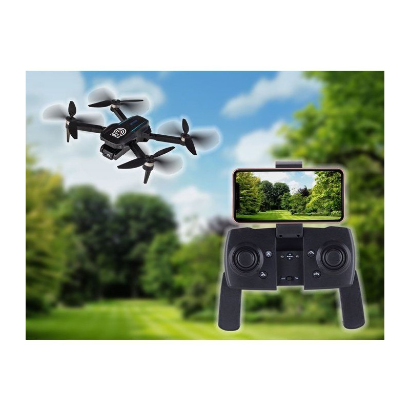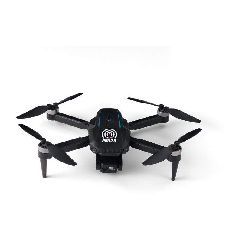 Drone pliable équipé d'une caméra Full HD avec stabilisateur, cardan 2 axes orientable et transmission vidéo en temps réel via smartphone. Moteurs brushless, mode Headless, décollage/atterrissage automatique, et 2 batteries offrant 15 min chacune. Livré avec sac de transport.