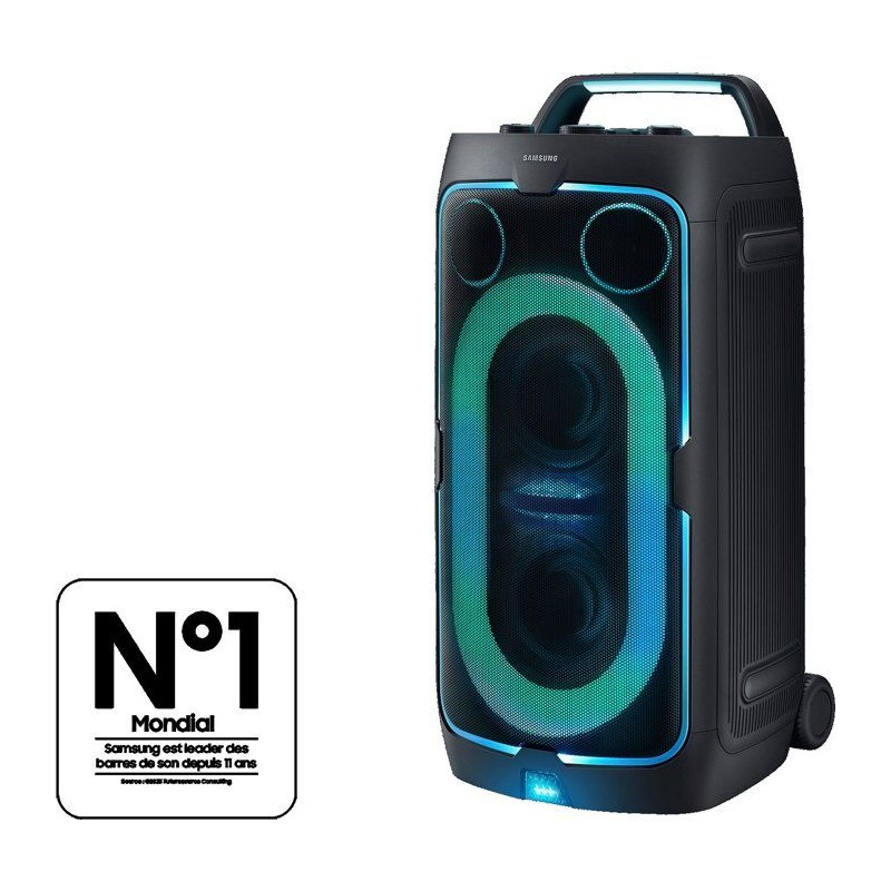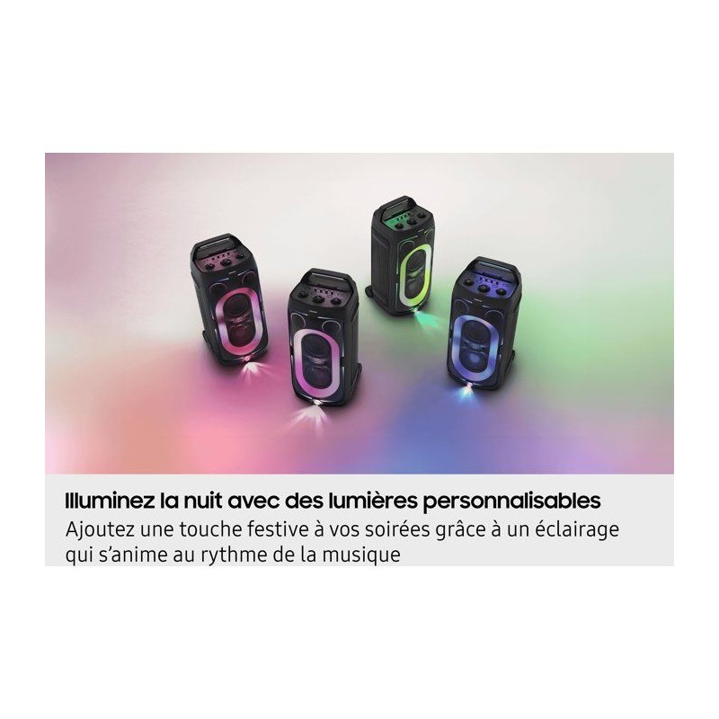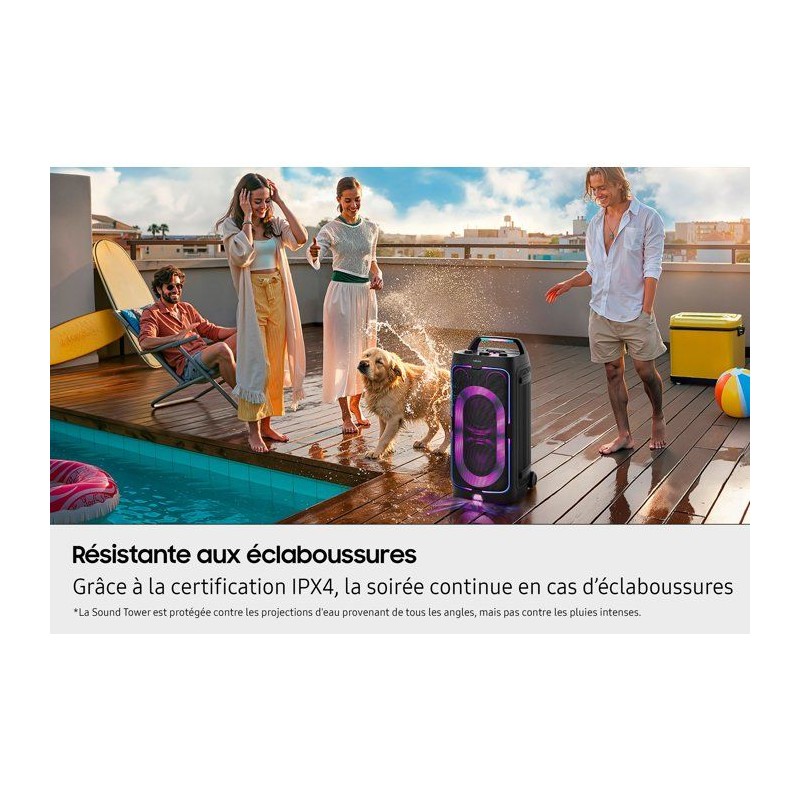 Vivez des moments intenses avec l'enceinte ultra-puissante Samsung Sound Tower MX-ST50F/XE, conçue pour transformer chaque instant en véritable fete. Avec ses 240 W de puissance, ses 4 haut-parleurs et ses modes sonores dédiés (Party, Hip-hop, EDM, Rock, Latin, House, Reggae...), elle vous plonge au coeur de la musique pour une ambiance explosive. Grâce a sa batterie remplaçable offrant jusqu'a 18 heures d'autonomie, profitez pleinement de vos playlists sans interruption, où que vous soyez. Son design mobile avec poignée et roulettes intégrées facilite tous vos déplacements, et sa certification IPX4 vous permet de l'utiliser au bord de la piscine sans crainte des éclaboussures. Les effets lumineux intégrés transforment instantanément l'ambiance, tandis que la fonction karaoké (avec réglages vocaux) et l'application Samsung Sound Tower vous donnent un contrôle total sur l'expérience sonore. Dotée du Bluetooth 5.4 et d'une compatibilité USB/Jack 3,5 mm, elle s'adapte a toutes vos sources musicales pour rester le centre de l'attention en soirée. Avec la MX-ST50F/XE, la fete vous suit partout.