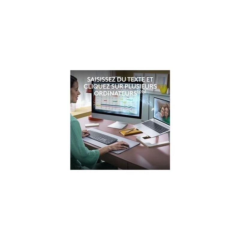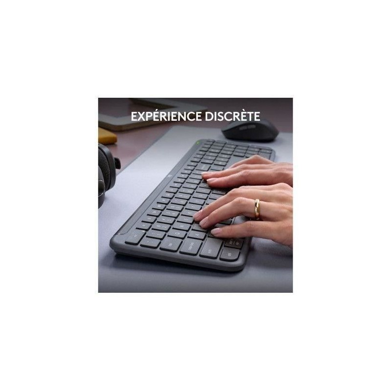 Le sans fil MK950 Signature Slim de Logitech est un ensemble clavier et souris sans fil au design élégant, offrant une saisie discrete et des clics silencieux. Idéal pour travailler sur plusieurs ordinateurs, cet ensemble propose des touches, boutons et raccourcis personnalisables via l'application Logi Options+. Le clavier, élégant et robuste, offre une saisie similaire a un ordinateur portable, tandis que la souris