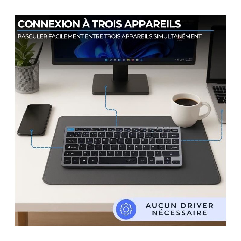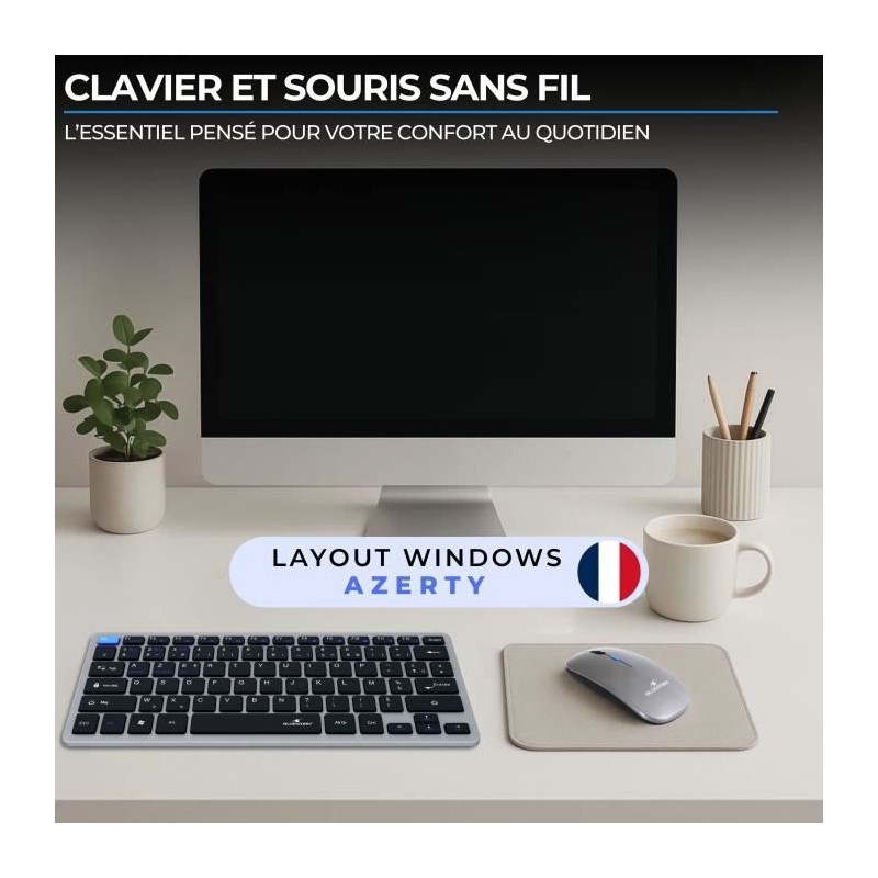 L'ensemble sans fil Bluestork Pack Mini combine un clavier compact et une souris ergonomique pour une utilisation confortable, que ce soit en télétravail, en déplacement ou a la maison. Ultra fin et léger, il se glisse facilement dans un sac ou une housse d'ordinateur, idéal pour les utilisateurs nomades. Le clavier offre une frappe fluide et silencieuse, avec une disposition AZERTY et des touches plates qui assurent rapidité et précision. La souris, ambidextre et ergonomique, assure un confort optimal pour la main, meme apres plusieurs heures d'utilisation. Grâce a sa double connectivité Bluetooth & Dongle USB, ce pack est compatible avec un large éventail d'appareils : PC, Mac, tablettes, smartphones, et peut passer d'un appareil a l'autre en toute simplicité. La connexion est stable et réactive, sans latence, pour un usage fluide. Points forts : Pack clavier + souris sans fil compact et élégant Double connexion : Bluetooth ou récepteur USB 2,4 GHz Clavier AZERTY silencieux et confortable Design ultra fin et léger pour un transport facile Compatibilité universelle : PC, Mac, tablettes, smartphones Idéal pour télétravail, home office et usage nomade Le Bluestork Pack Mini est la solution parfaite pour ceux qui recherchent un ensemble discret, élégant et performant pour travailler partout avec efficacité.