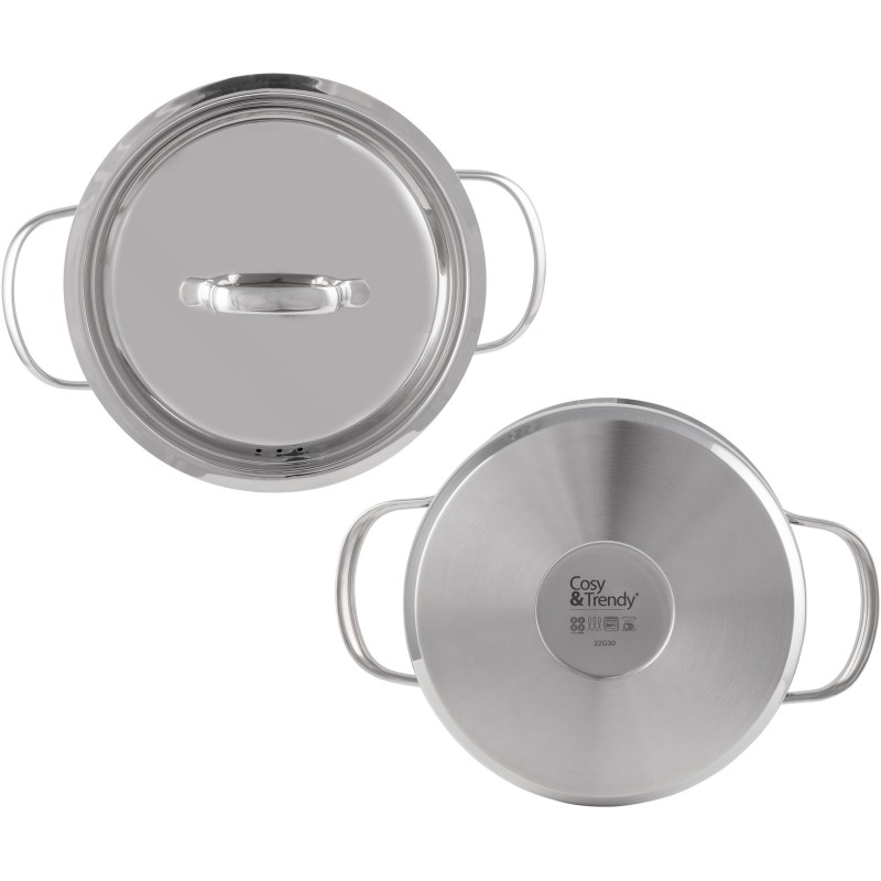 La série Daily en inox est un must pour tout cuisinier. Le fond en aluminium encapsulé assure une conduction thermique idéale et le trou de vapeur permet de réguler l'humidité. Toutes les poeles et casseroles sont brillantes a l'extérieur et mates a l'intérieur. Notez aussi l'indicateur de mesure pratique. Les poignées sont en inox et soudées a la casserole. Daily convient a toutes les plaques de cuisson (meme induction) et va au four jusqu'a 200°C. Cette série peut aller au lave-vaisselle.