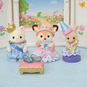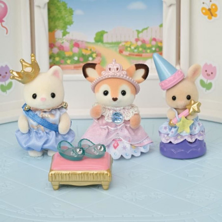 Les bébés Biche, Chat Soie et Lapin Creme sont prets pour le spectacle. Chaque bébé porte un costume spécial pour la piece, pour interpréter le prince, la princesse et la fée. Chaque bébé possede son accessoire : une couronne, des pantoufles de verre et une baguette. Les figurines sont articulées et habillées avec soin. Leurs vetements peuvent etre enlevés et remis a loisir.