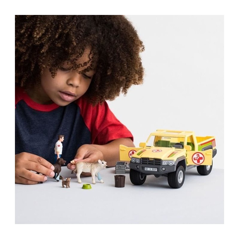 Le kit d'extension pour le cabinet vétérinaire avec animaux de compagnie de Schleich® Farm World permet de soigner un veau en urgence. Le vétérinaire saute rapidement dans son pick-up et se précipite a la rescousse ! Ce coffret de 12 pieces comprend des animaux de la ferme, un véhicule et un vétérinaire. Convient aux enfants a partir de 7 ans.