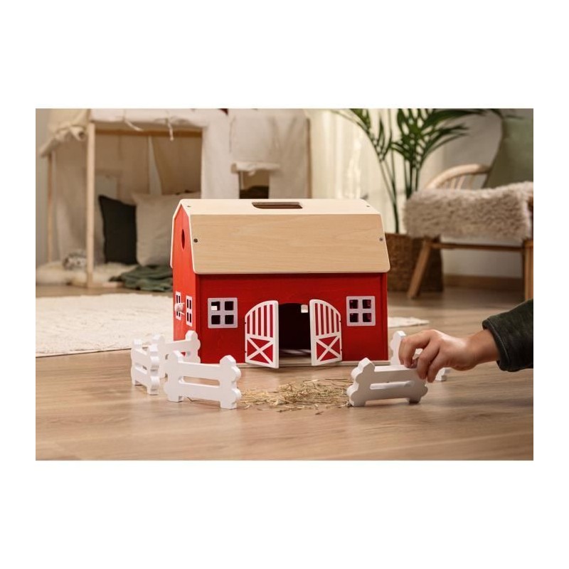 Celui qui contemple les pr‚s ne mettra pas longtemps ... trouver la ferme. Peinte en rouge vif, elle attire imm‚diatement l?attention avec sa grande porte de grange et son toit imposant. Les murs du bƒtiment en bois sont peints en rouge, avec des cadres de fenˆtres et des croisillons de porte en blanc. Cela a l?air tellement accueillant qu?on a envie de s?y arrˆter imm‚diatement. Un coup d??il ... l?int‚rieur r‚vŠleÿ: le grenier offre beaucoup d?espace pour le foin et la paille. Les ‚l‚ments de cl"ture blancs sont rang‚s dans l?‚table. Il ne manque plus qu?... les assembler pour cl"turer la prairie. Voil..., tout est prˆt pour l?arriv‚e des animauxÿ! Quand viendront-ilsÿ?