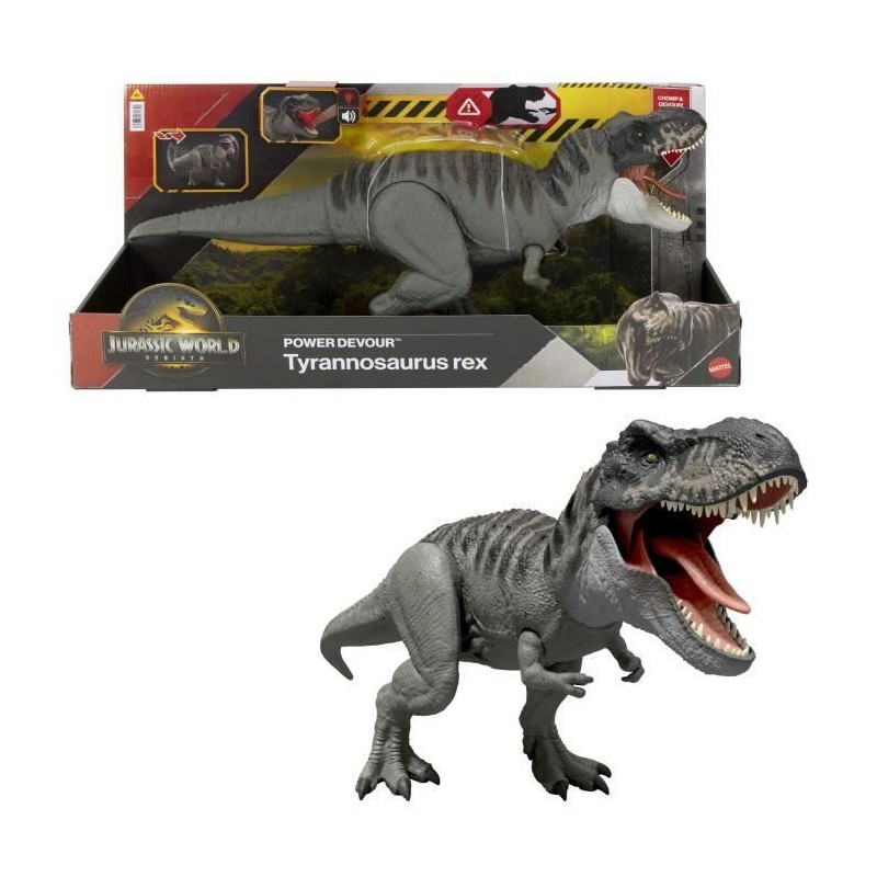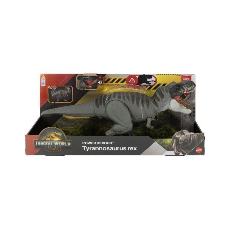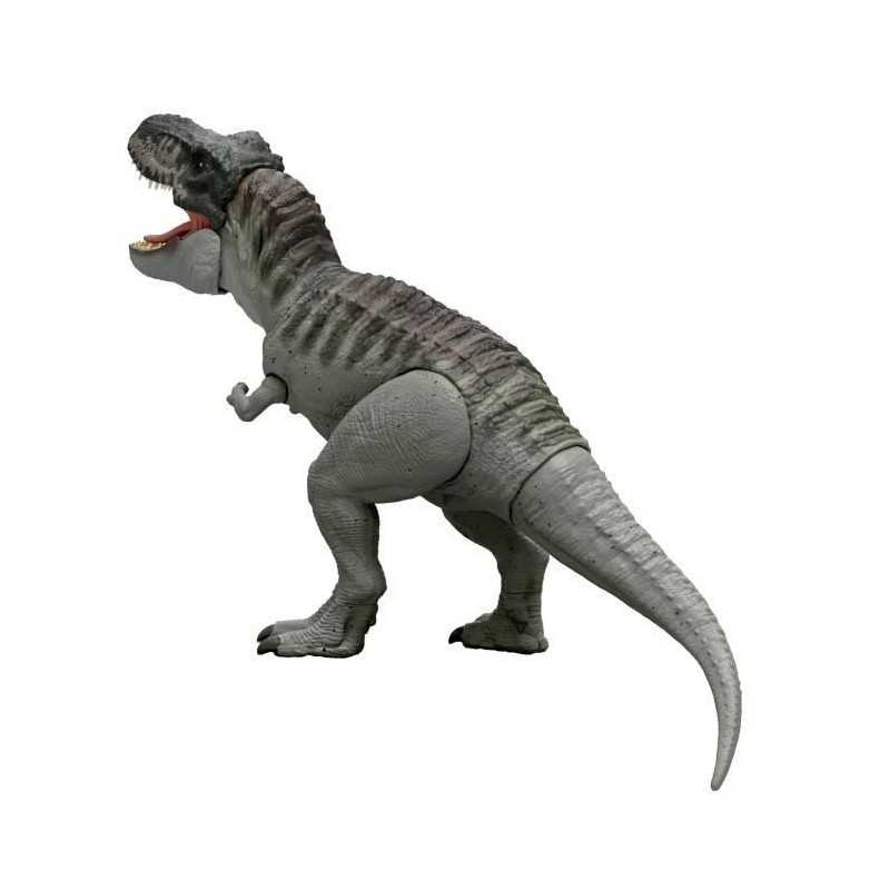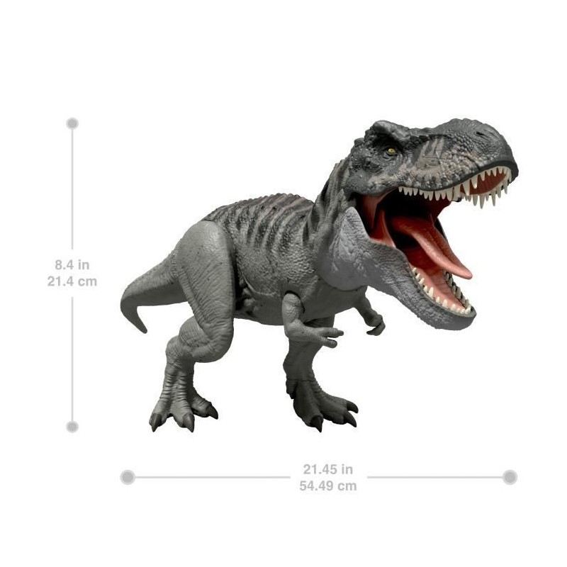 Ce Tyrannosaure Furieux Prédateur inspiré du film 'Jurassic World : Renaissance' peut attaquer en donnant de féroces coups de mâchoire ! Le dinosaure rugit triomphalement lorsque sa langue est enfoncée. Lorsque la langue est maintenue enfoncée plus longtemps, la fonction 'mordre en continu' s'active avec des effets lumineux et sonores ! Cette fonction permet au T-Rex de mordre d'autres figurines de dinosaures pour multiplier les possibilités de combats épiques ! Manipulez la queue pour que le dinosaure remue la tete de haut en bas ou de gauche a droite en ouvrant son énorme mâchoire ! Dans l'application gratuite Jurassic World Play, scannez le code de suivi présent sur la patte du dinosaure a l'aide d'un appareil connecté compatible (Android ou iOS, non inclus) pour déverrouiller une version numérique du dinosaure et jouer a des jeux férocement amusants, dont des courses avec plusieurs véhicules sur terre, dans les airs et en mer. Excellente idée de cadeau pour les fans de dinosaures a partir de 4 ans. Les couleurs et les décorations peuvent varier.