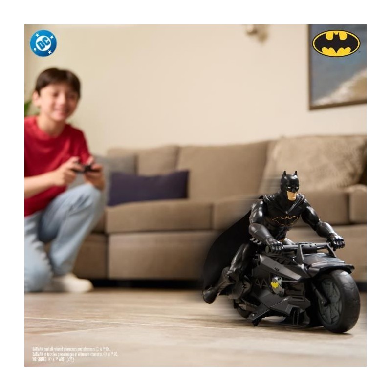 Dirige Batman a bord de sa Batcycle. Place la figurine de Batman sur sa moto et dirige-le a toute vitesse grâce a la télécommande toutes directions facile a piloter. Pour jeu en intérieur et en extérieur. Technologie 2.4 Ghz. 6 piles LR6 pour la Batcycle et 2 piles pour la télécommande (non fournies) A partir de 4 ans.