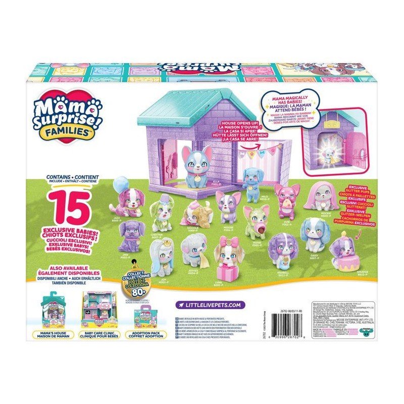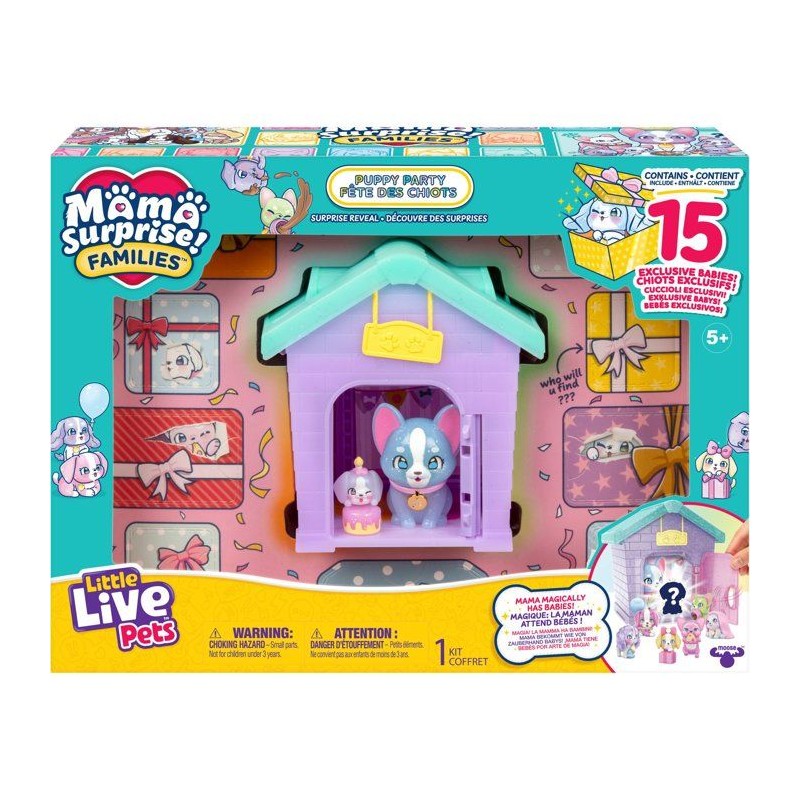 Agrandis l'univers Mama Surprise Families avec le coffret Fete des Chiots ! Découvre une maman et 15 chiots colorés qui apparaissent comme par magie. Inclus une niche a personnaliser, des autocollants et un guide de collection. Des 5 ans pour des moments adorables !